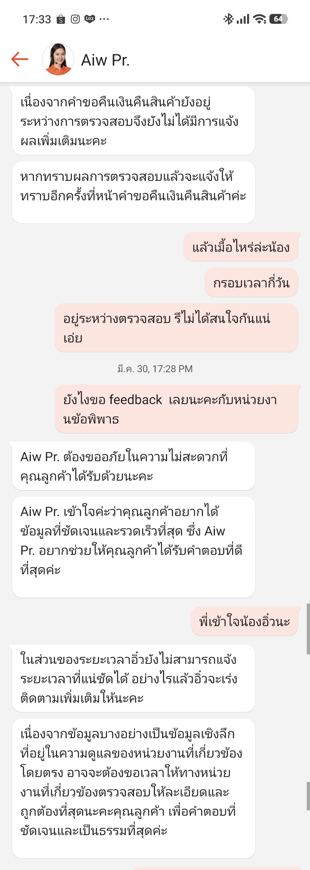 สืบเนื่องจาก ซื้อ Samsung S26 ultra แล้วเจอรอย เลยส่งเรื่องขอคืนเงิน วันที่ 27 มีนาคม , ระบบแจ้งว่า จะแจ้งผลให้ทราบ 30มีนาคม รอมาทั้งวันเงียบ ก็เลยโทรสอบถาม shopee เจ้าหน้าที่แจ้งว่า ที่บอกจะแจ้งผล 30 มีนาคม คือ คาดการณ์เฉยๆ เรานี่งงเลย จะมาคาดการณ์อะไรก่อน ก็ระบบขึ้นเอง จะแจ้งผล ไม่ได้ขึ้นว่า คาดการณ์แจ้งผล เราเลยถามขอกรอบเวลาแจ้งผลด้วยได้ไหม , ก็ให้ไม่ได้ ให้รอ รึให้แชทถามกับเจ้าหน้าที่พิพาทไป ซึ่งแชทถามก็ไม่ตอบใดๆ ไม่รู้เขาลาออกไปหมดทั้งแผนกรึเปล่า? จริงๆถึงเวลาในระบบควรจะแจ้งกับลูกค้า แจ้งถึงความคืบหน้าไม่ใช่เงียบแบบนี้
