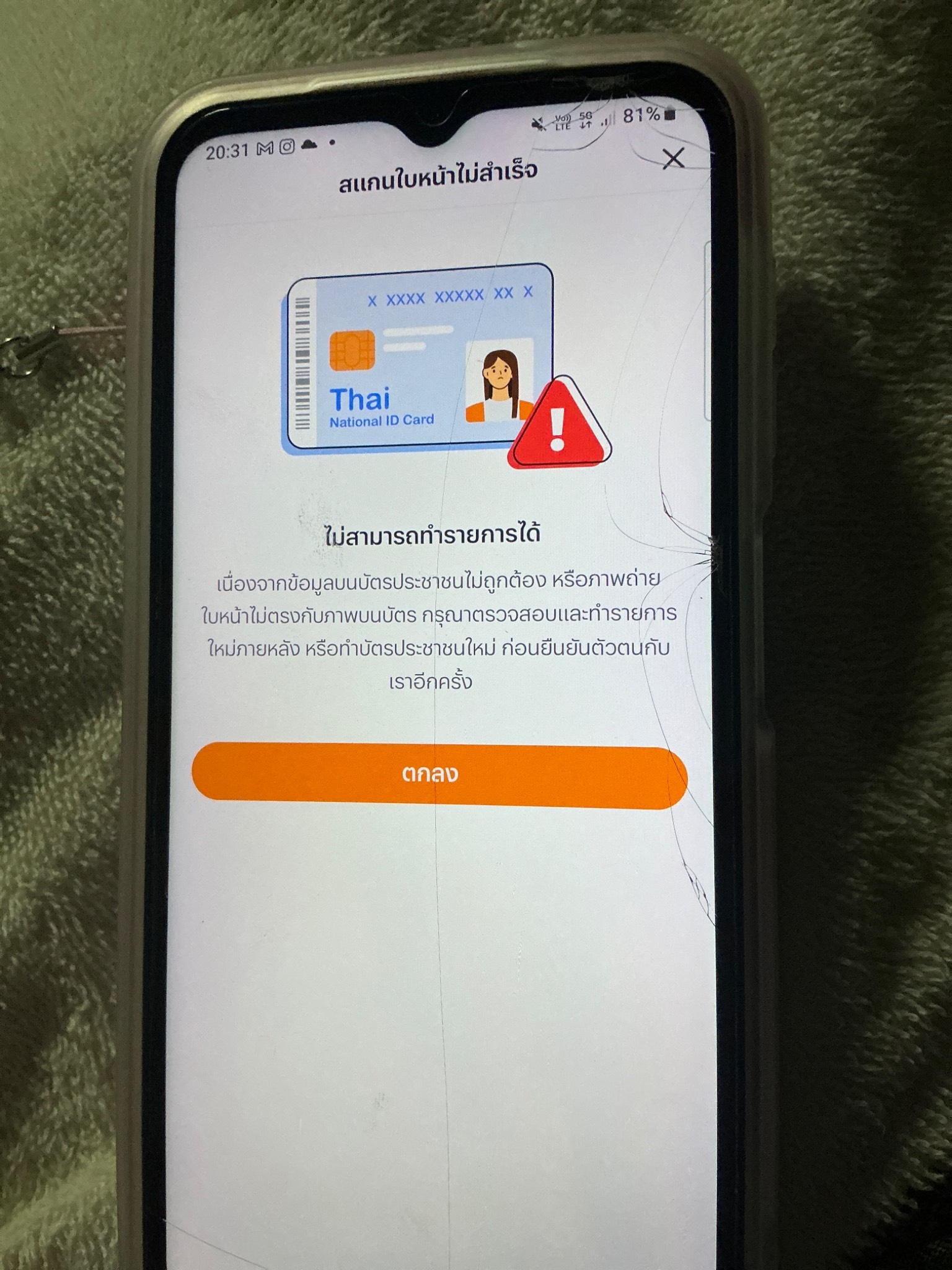 เราสแกนใบหน้าไปแล้วแอพมันบอกว่าไม่ตรงกับในบัตรค่ะ แต่มันก็เป็นหน้าเราจริง ๆ นะคะ เราเคยใช้แอพนี้อยู่ค่ะแต่ตอนนี้ไม่ได้ใช้บัญชีนั้นแล้วเราจะลงทะเบียนใหม่แต่ก็สแกนหน้าไม่ผ่านค่ะ รอบล่าสุดพอจะกดสแกนหน้าแล้วมันขึ้นแบบนี้ เราพึ่งจะไปถ่ายบัตรมาเองค่ะต้องไปถ่ายใหม่เลยหรอออ ช่วยเราด้วยค่ะ 🥹🥹