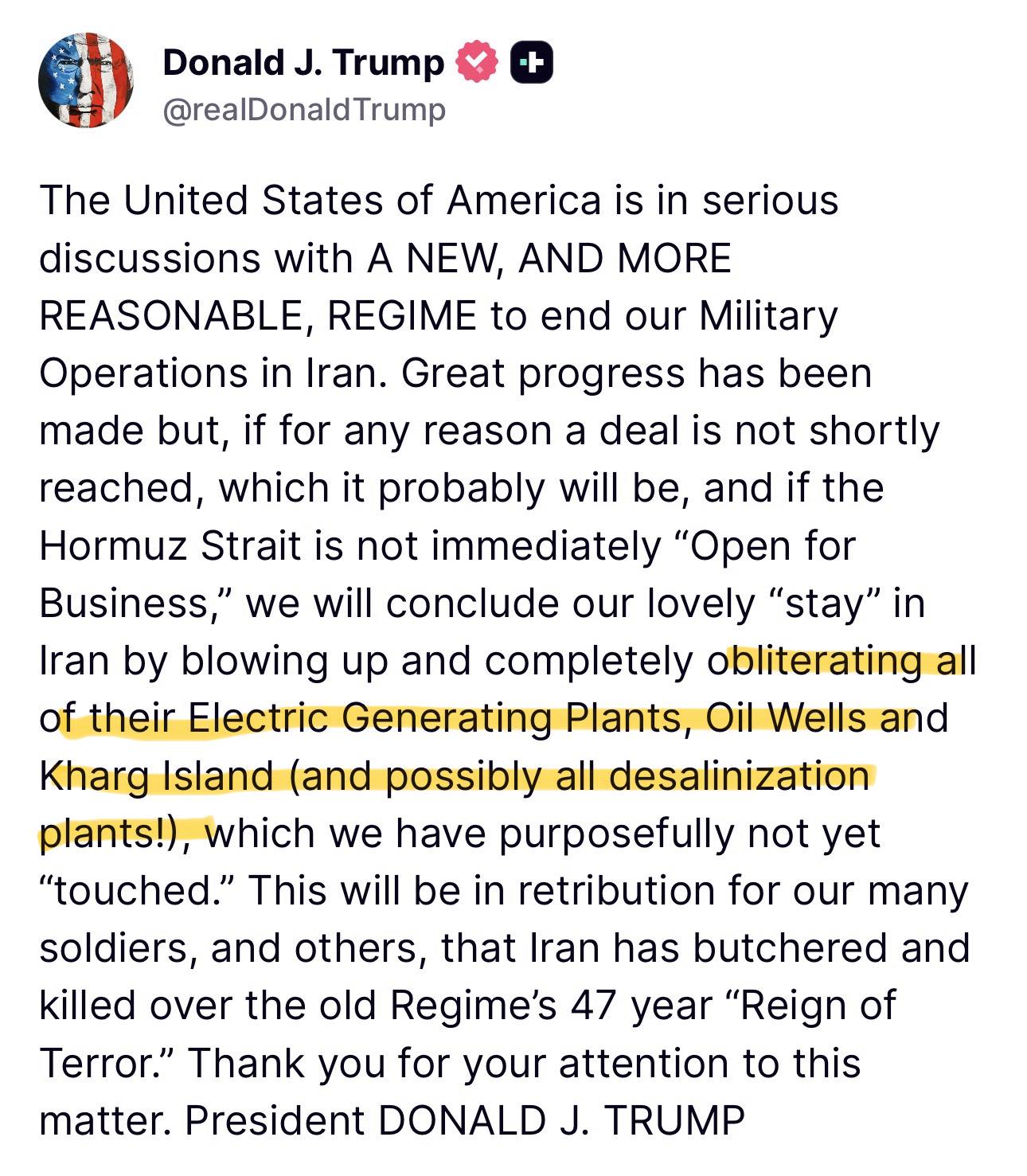 Trump ขู่ระเบิดและทำลายล้างโรงไฟฟ้าทั้งหมด บ่อน้ำมัน และเกาะคาร์ก (รวมถึงโรงผลิตน้ำจืดจากน้ำทะเลทั้งหมด!)
