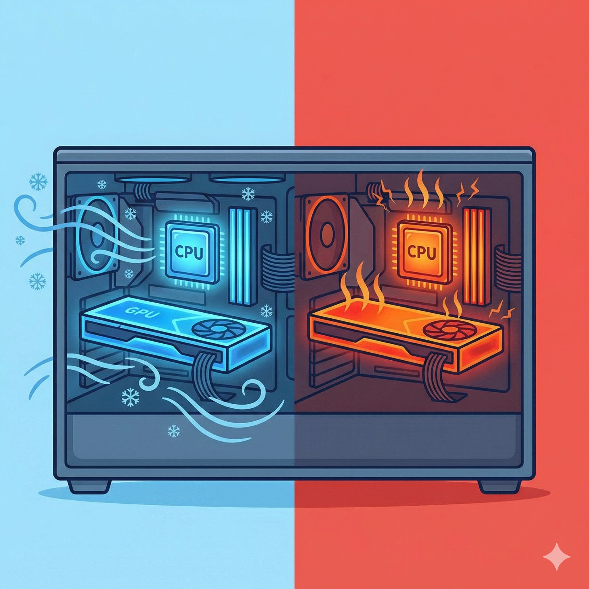 3. ตรวจสอบทิศทางลมในเคส (Airflow) PC ต้องมีระบบลมที่ดี (หน้าดูดเข้า - หลัง/บนเป่าออก) ถ้าพัดลมใส่ผิดทิศทาง ลมร้อนจะวนอยู่ข้างใน