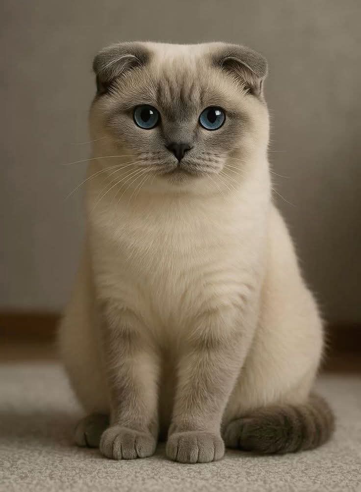 🐾หูพับ (The Fold) เป็นเอกลักษณ์สูงสุด เกิดจากการกลายพันธุ์ทางพันธุกรรมที่ทำให้กระดูกอ่อนที่หูอ่อนตัวลง โดยหูจะเริ่มพับเมื่อลูกแมวอายุประมาณ 3-4 สัปดาห์ (อย่างไรก็ตาม ไม่ใช่ทุกตัวในคอกที่จะหูพับ)