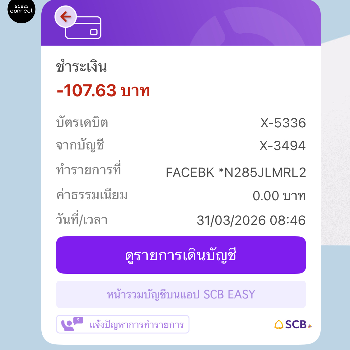 ถูกหักเงินจากแอพ scb คือค่าอะไรครับ FACEBK*KZCKTRQDS2