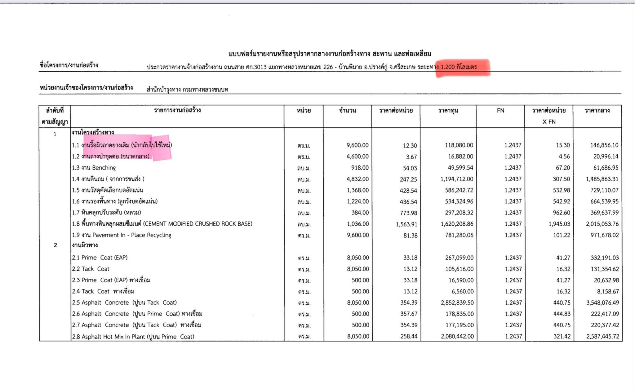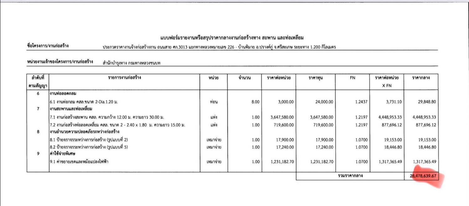 ไทยพีบีเอสได้ตรวจสอบข้อมูลจากแขวงทางหลวงชนบทศรีสะเกษ พบว่า โครงการกอสร้างถนนสายนี้มีระยะทาง 1.200 เมตร (1.2 กิโลเมตร) ช่วง กม.21+300 ถึง กม.22+500 ใช้งบประมาณ 28,470,000 บาท (28.4 ล้านบาท) มีลักษณะงาน คือ ขยายความกว้างถนน จาก 6/8 เมตร ขยายให้เป็นถนนกว้าง 7/12 เมตร