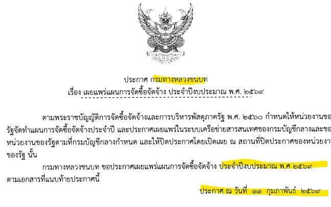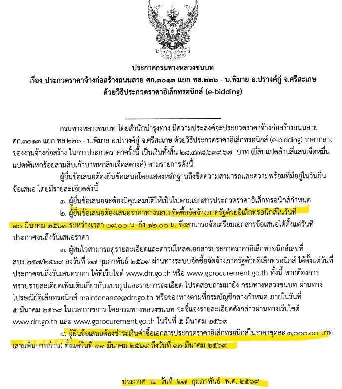 1.กรมทางหลวงชนบท ประกาศเปิดเผยแผนจัดจัดซื้อจัดจ้างงบประมาณ ปี 2569 ระบุ โครงการถนน ก่อสร้างถนนสาย ศก.3013 แยกทางหลวงหมายเลข 226 บ้านพิมาย อ.ห้วยทับทัน - อ.ปรางค์กู่ จังหวัดศรีสะเกษ เมื่อวันที่ 11 ก.พ.2569