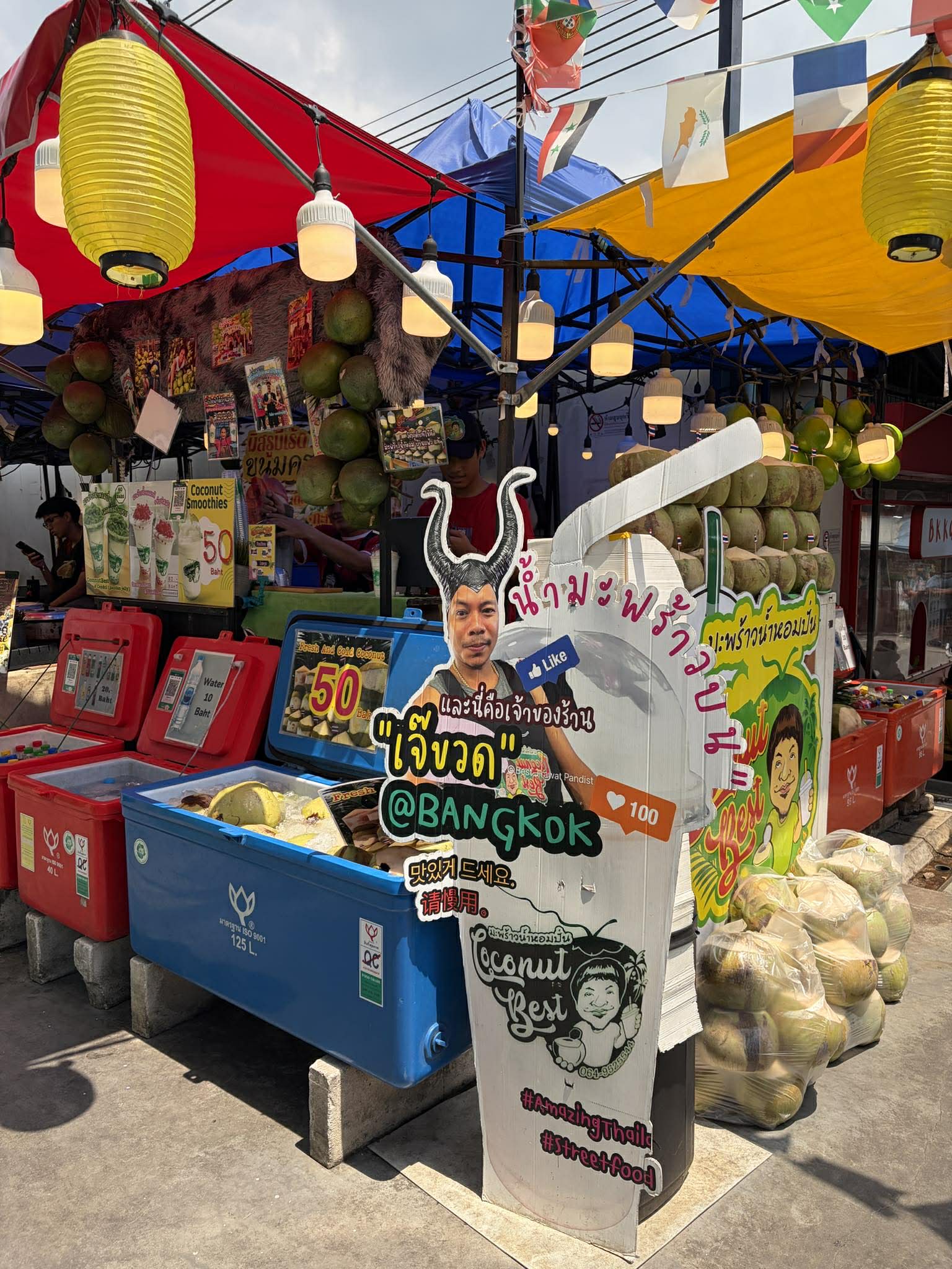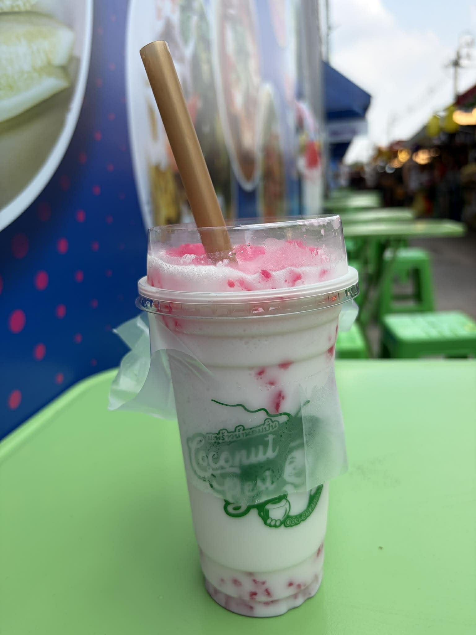 เมนูน้ำเป็น มะพร้าวน้ำหอมปั่นทับทิมสยาม แก้วสูง รสชาติหอมมัน กินเข้าดีกับทับทิมกรอบ หรือใครชอบลอดช่อง ก็สั่งได้ค่ะ ฉันสั่งหวานน้อย รสชาติกำลังพอดีเลย สดชื่นๆ  หน้าร้านเขามองมาจากสยามก็รู้ทันทีค่ะว่าขายน้ำมะพร้าว และเขาเปิดเพลงเสียงดังกระหึ่ม สร้างบรรยากาศครื้นเครง