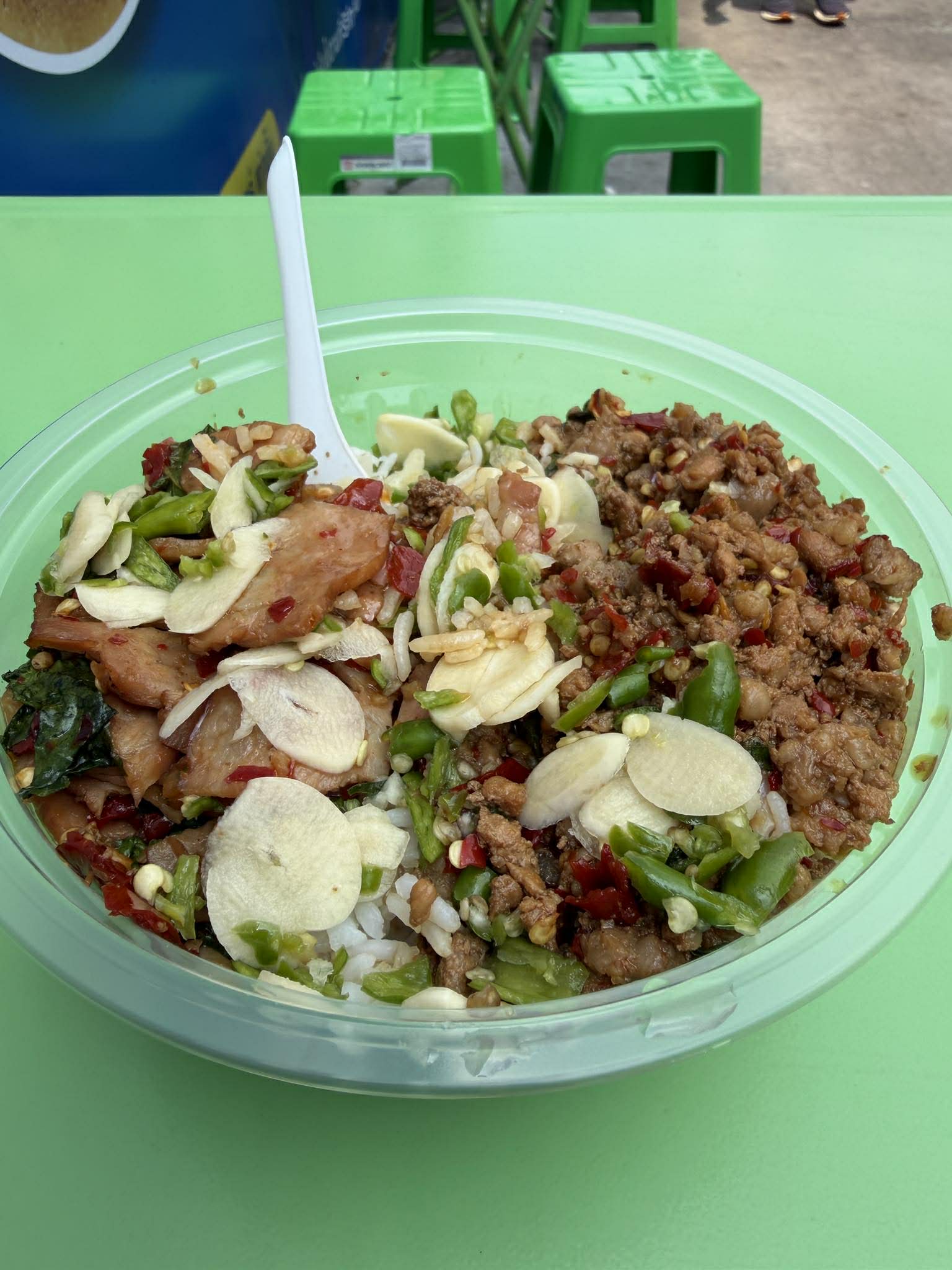 ส่วนเมนูข้าว เรากินร้านติดกันเลย เป็นร้านกะเพราะที่มีเมนูเยอะมาก ไก่ เนื้อ หมู เบคอน เครื่องใน อีกทั้งยังมีความเผ็ดให้เลือก 3 ระดับ ฉันก็สั่งเผ็ดมากไปเลยค่ะ และเลือกกินเป็นหมูสับกับเบคอนค่ะ รสชาติกลางๆ ค่ะ ไม่เค็มจัด และแม้ว่าฉันจะสั่งเผ็ดจัด แต่ก็ไม่ได้เผ็ดจนกินไม่ได้ค่ะ กำลังกินดี ส่วนใครชอบเผ็ดมากๆๆๆๆๆ อาจจะยังไม่ถึงใจ ที่โดนใจคือน้ำปลาพริกกระเทียม ที่กระเทียมหั่นบาง กินคู่กันแล้วสะใจมากค่ะ ตักเท่าไหร่ก็ได้เลยด้วย