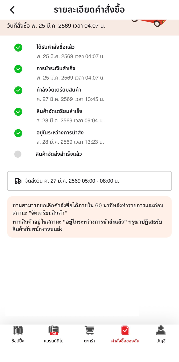 ผมได้สั่งสินค้าผ่านแอพ Makro Pro วันที่ 24 มี.ค. 69 โดยระบุรอบให้จัดส่งในวันที่ 27 มี.ค.69 เวลา 05.00-08.00 พอถึงวันจัดส่งกลับไม่มีสินค้ามาส่งให้ โทรไปติดตามกลับแจ้งว่าสินค้าหมดหลายรายการทำให้ต้องไปให้คลังสินค้าอื่น(บางนา) จัดส่งให้แทน แต่ไม่มีการติดต่อมาแจ้งแต่อย่างใด ติดต่อ 1432 เข้าไปสอบถามก็ไม่สามารถให้คำตอบได้ว่าจะจัดส่งสินค้าให้ได้วันไหน ทำได้แค่ประสานงานไปยังสาขาให้ตรวจสอบและให้ติดต่อกลับแค่นั้น ซึ่งโทรไปตามกี่รอบก็ได้รับคำตอบแบบนี้และไม่มีการติดต่อกลับจากสาขาแต่อย่างใด จะยกเลิกรายการสั่งซื้อก็ไม่ได้เนื่องจากเจ้าหน้าที่แจ้งว่า สถานะอยู่ระหว่างจัดส่ง ต้องแจ้งปฏิเสธรับสินค้าจากเจ้าหน้าที่ขนส่งเท่านั้น ผมเลยถามกลับไปว่าไม่ได้รับการติดต่อจากขนส่งเลยแล้วจะให้ปฏิเสธยังไง ก็ยืนยันว่ายกเลิกให้ไม่ได้ โทรติดตามทุกวันตั้งแต่วันที่ 28 วันละหลายรอบมากๆ จนเมื่อวานวันที่ 30 มี.ค.69 ผมทั้งโทร ทั้งไลน์ OA (ไม่มีการตอบกลับ) ทั้งทักหาเพจ Mako ยื่นคำขาดว่าถ้าไม่มีการติดต่อกลับใดๆ ผมจะร้องเรียน จนมีเจ้าหน้าที่สาขาบางนาโทรมาแจ้งว่าช่วงเวลาที่ผมสั่งระบบของ Makro มีปัญหาทำให้ออเดอร์นอกเขตไปที่สาขาบางนาจำนวนมาก แล้วทางขนส่งเอาสินค้าออกไปตั้งแต่วันที่ 28 มี.ค.69 แล้วแต่ทางสาขายังติดต่อขนส่งไม่ได้ ไม่ได้นำสินค้ามาคืนแล้วก็ไม่ได้เอามาส่งด้วย ทางสาขาจึงแจ้งกับผมว่าจะจัดส่งให้อีกทีในวันนี้รอบ 05.00-08.00 จนถึงวันนี้ 31 มี.ค.69 เลยกำหนดส่งสินค้ามาแล้ว 5 วัน ทางผมก็ยังไม่ได้รับสินค้าเลยครับ ทางผมต้องไปหาซื้อสินค้าจากที่อื่นเพื่อเอามาขายก่อน แย่มากๆครับแบบนี้ ก่อนหน้านี้มีปัญหาแค่สินค้าขาด ไม่ครบ ช้าแต่ยังอยู่ในวัน แต่รอบนี้ไหวจริงๆครับ รู้ว่าตกหล่นก็น่าจะแก้ไขปัญหาให้ลูกค้าได้เร็วกว่านี้