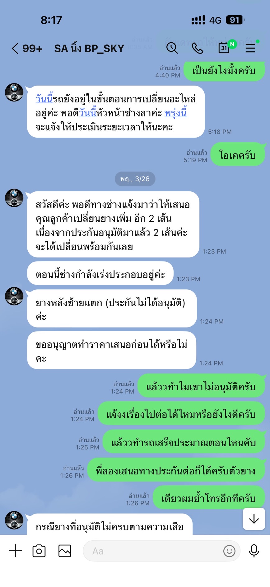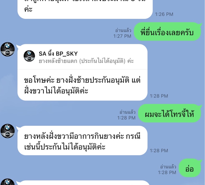 ซึ่งทางศูนย์ประเมินแล้วไม่ปลอดภัยและไม่สามารถที่จะใช้ในการขับขี่ต่อได้ ทางศูนย์ได้ยื่นเรื่องเคลมทั้ง2ข้าง ทางประกันอนุมัติมาแค่ข้างซ้ายที่แตก รอบ2ยื่นเพิ่มเพราะล้อด้านขวาก็ได้รับความเสียหายหน้ายางบางไม่สามารถที่จะนำมาหน้ายางบางจนไม่สามารถที่จะนำมาใช้ใส่รถขับขี่ได้แล้วยังไม่เคลมให้ (ถ้าจะบอกว่าหน้ายังบางอยู่แล้วสองล้อหน้าไม่มีล้อไหนที่บางเลย) ไม่คำนึงถึงความปลอดภัยของลูกค้า เป็นคุณจะกล้าขี่ไหม? ทั้งที่อุบัติเหตุความเสียหายมันเกิดในรอบนั้นเป็นประกันภัยชั้นหนึ่งที่แย่มาก ถ้าคิดว่าใส่ได้ขับขี่ได้ก็ลองเอาไปขี่เอง อย่างน้อยก็ควรให้ความประทับใจกับลูกค้าที่ได้รับอุบัติเหตุและแจ้งเคลมกับ(ประกันภัยชั้น1)ของคุณด้วย มีปัญหามาโดยตลอดตั้งแต่กันชนหน้าที่ไม่ยอมเคลมแล้ว ต้องได้มาโพสต์ต้องได้โทรตามทุกวันถึงอนุมัติให้ กันชนหน้าเกิดจากอุบัติเหตุเป็นรอยบอกไม่เกี่ยวข้องกับอุบัติเหตุรถดีดีไม่เคยเคลมความเสียหายทั้งหมดมันก็เกิดจากอุบัติเหตุครั้งนั้นเพราะก็ควรจัดการเรียบร้อยให้หมด ไม่ใช่ต้องให้ลูกค้าตามขนาดนี้ 2เดือนแล้ว