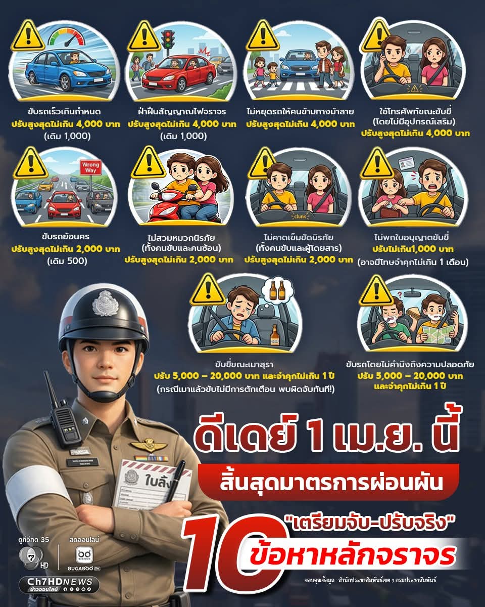 🚨 ดีเดย์ 1 เม.ย. นี้! เตรียมจับ-ปรับจริง 10 ข้อหาหลักจราจร