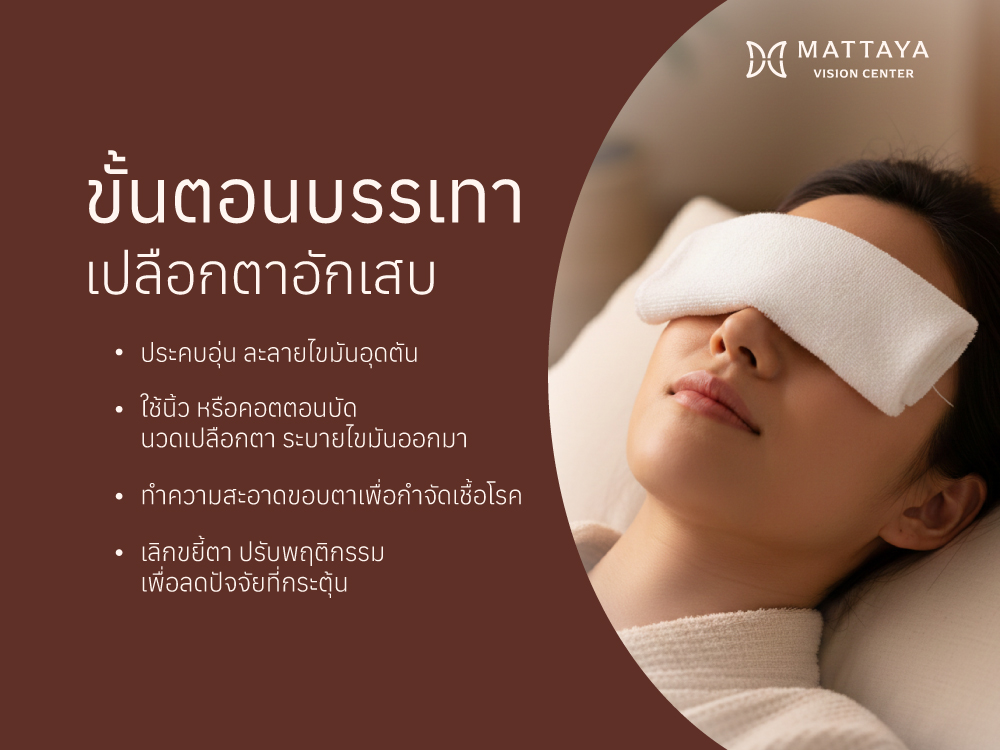 - ใช้ผ้าสะอาดชุบน้ำอุ่น (ประมาณ 40-45 องศาเซลเซียส) หรือใช้เจลประคบตาสำเร็จรูป วางบนเปลือกตา 5-10 นาที ควรทำวันละ 2 ครั้ง เช้า-เย็น