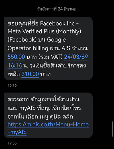 ที่ตั้งกระทู้เพราะอยากแชร์ประสบการณ์ี่ถูกคิดค่าบริการสมัคร Facebook Meta Verified และทำใจไว้แล้วว่าคงหวังพึ่งพิงเครือข่ายที่ใช้บริการอยู่ไม่ได้แล้วจริงๆ เริ่มจากวันที่ 24 มีนาคม ประมาณบ่าย4โมงกว่า มี sms ส่งมาว่า "ขอบคุณที่ซื้อ Facebook Meta Verified บลาๆๆๆ" (รูปประกอบ)
