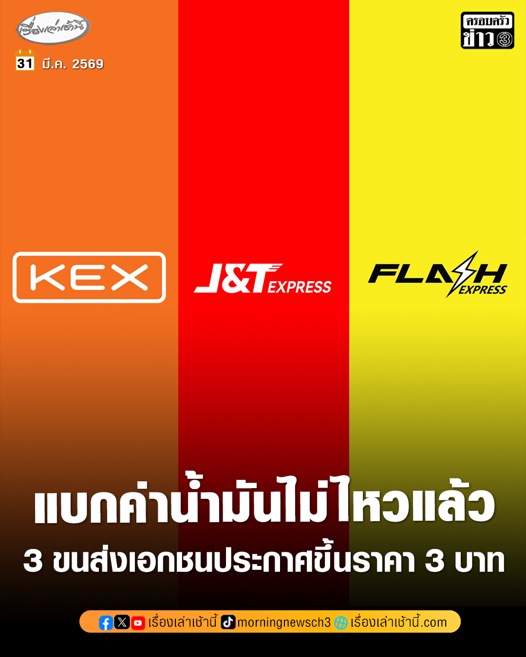 3 ขนส่งเอกชน แบกรับภาระน้ำมันแพงไม่ไหวประกาศขึ้นค่าขนส่งชิ้นละ 3 บาท เริ่ม 1 เม.ย.