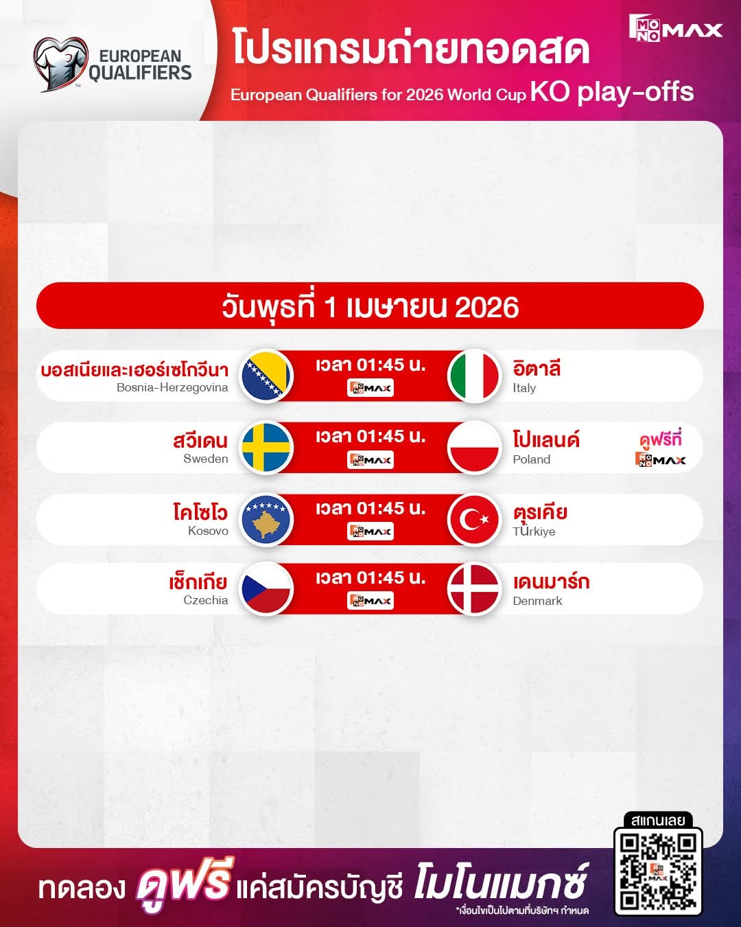🔎 โปรแกรมการแข่งขัน ฟุตบอลโลก 2026 รอบคัดเลือก โซนยุโรป ⚽🔥 (ประจำเดือน ตุลาคม)