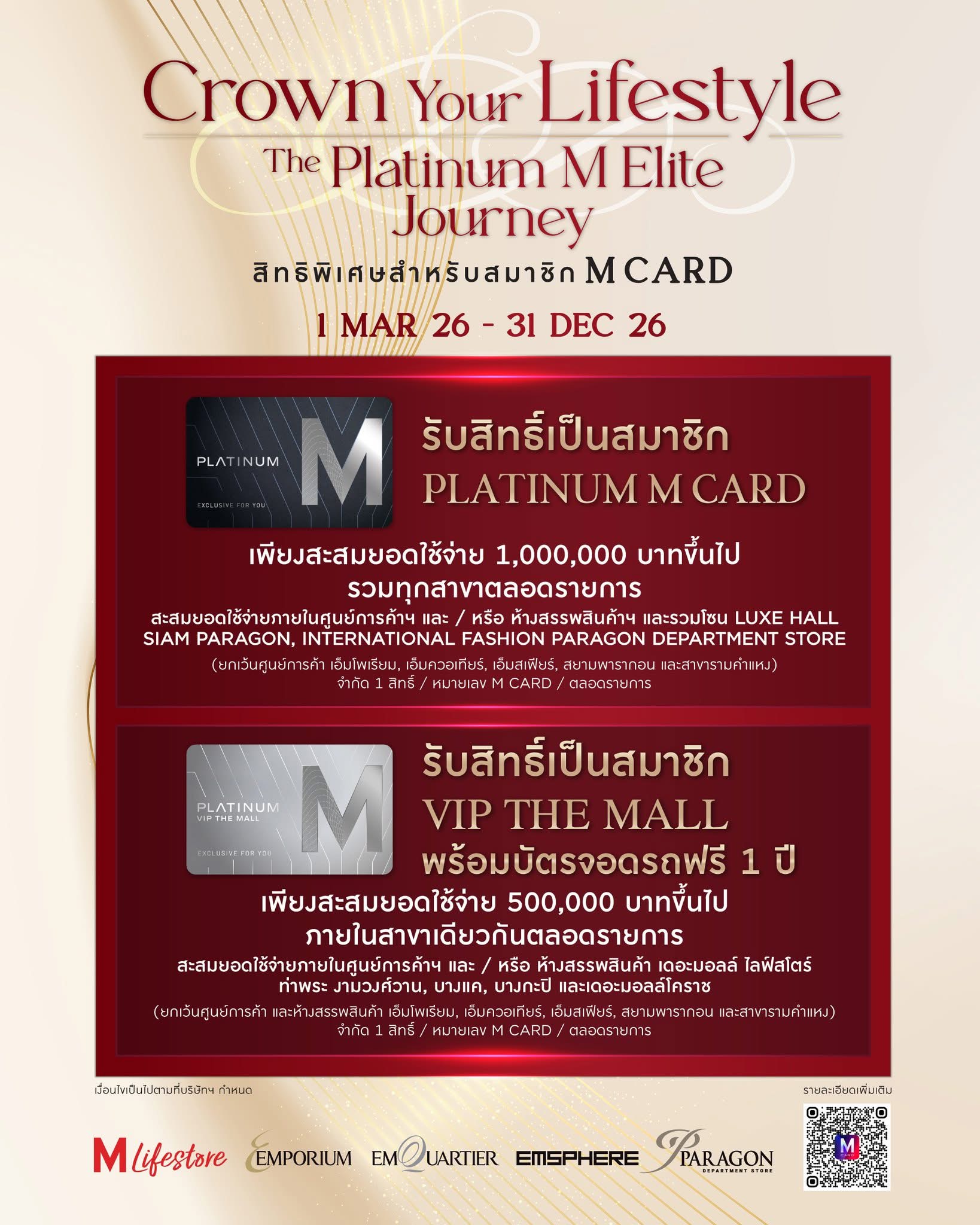 สิทธิพิเศษสำหรับผู้ถือบัตรสมาชิก M Card เมื่อมียอดใช้จ่ายสะสมยอด 1,000,000 บาทขึ้นไป รวมทุกสาขาตลอดรายการ ภายใต้ชื่อ-สกุล หมายเลขบัตรเดียวกัน ภายในห้างสรรพสินค้าฯ และ / หรือ ศูนย์การค้าฯ สาขาที่ร่วมรายการ และรวมโซน Luxe Hall Siam Paragon, International Fashion Paragon Department Store ระหว่างวันที่ 1 มีนาคม 2569 - 31 ธันวาคม 2569