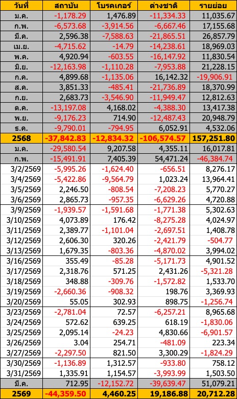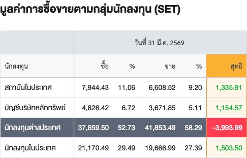 Sinthorn Summary 31/3/2569 : ต่างชาติขายสุทธิ -3,993.99 ลบ.