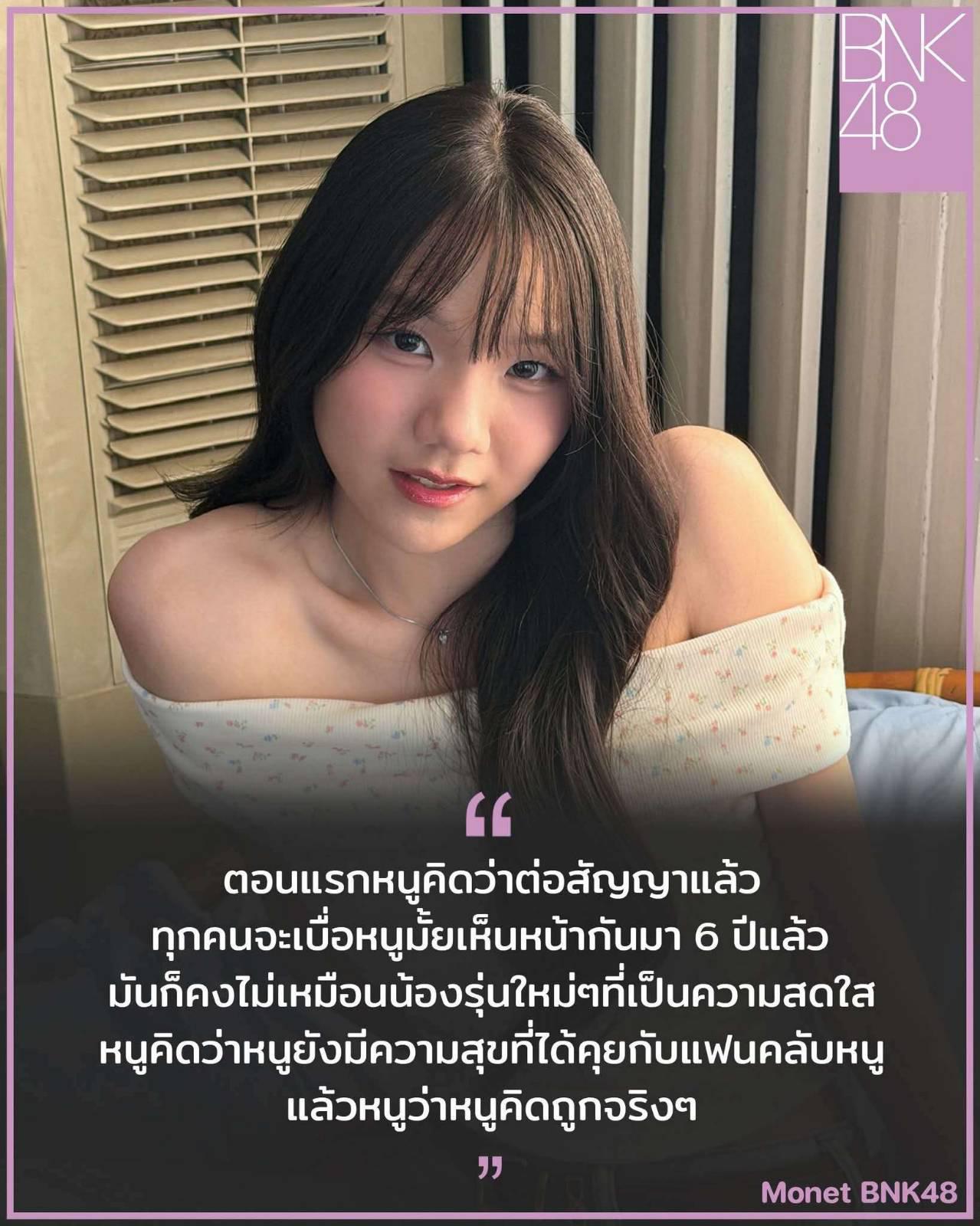 โมเน่ต์ : ตอนแรกหนูคิดว่าต่อสัญญาแล้ว ทุกคนจะเบื่อหนูมั้ย เห็นหน้ากันมา 6 ปีแล้ว มันก็คงไม่เหมือนน้องรุ่นใหม่ๆ ที่เป็นความสดใส หนูคิดว่าหนูยังมีความสุขที่ได้คุยกับแฟนคลับหนู แล้วหนูว่าหนูคิดถูกจริงๆ