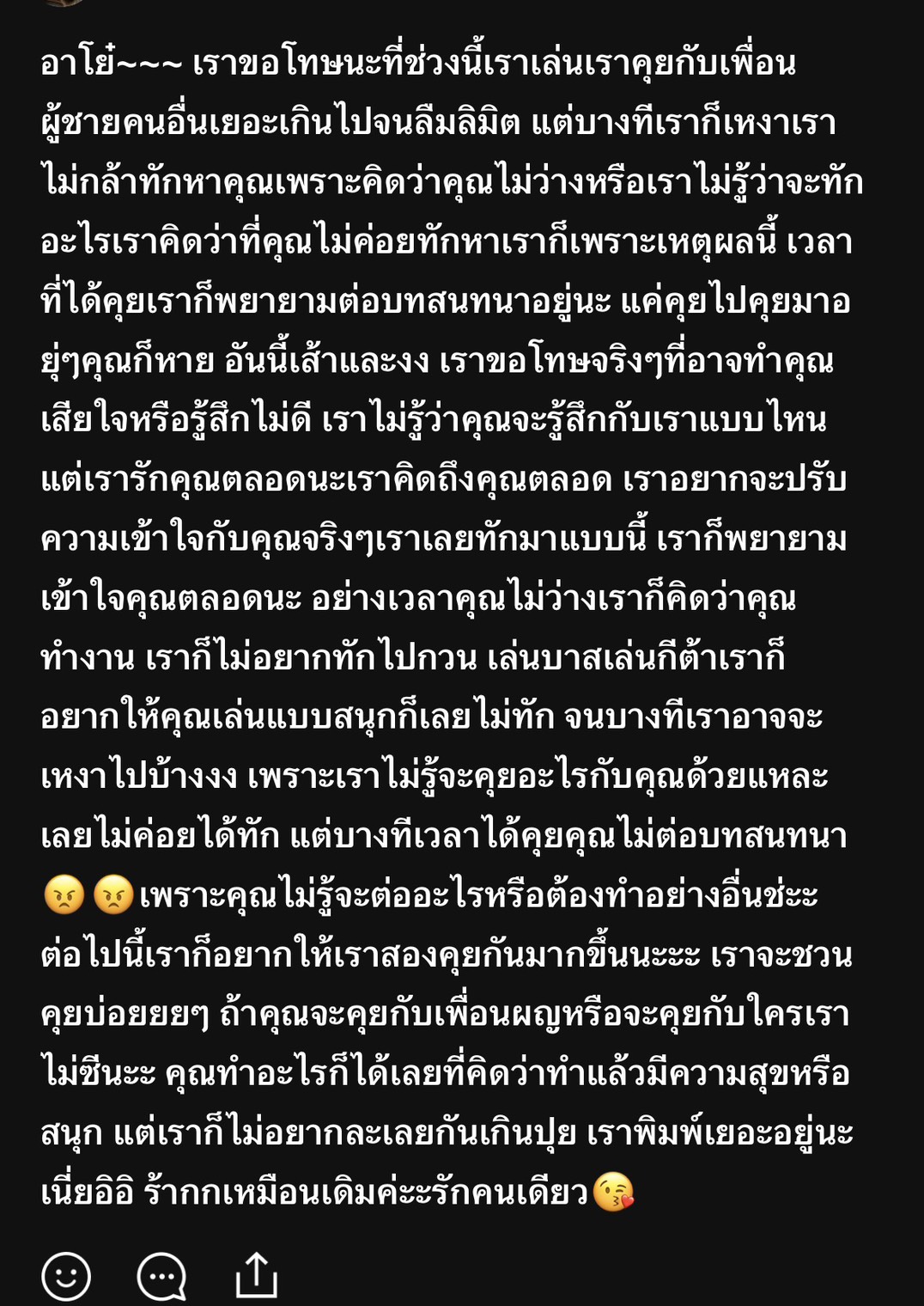 วันที่ 1 มิถุนายน 2569 วันนั้นหนูกับเพื่อนนัดกันไปยิมซึ่งมีเพื่อนของเพื่อนไปด้วยหนูขอเรียกว่านายบี ในวันนั้นเราก็ได้รู้จักกัน ซึ่งเราสองคนนั้นเข้ากันได้ดีมาก จบจากโรงเรียนเดียวกันตอนนี้ก็อยู่โรงเรียนเดียวกัน หนูคุยกับนายบีเยอะมากทุกวันเลยล่ะ บางที่เล่นเกมด้วยกันแล้วก็ลงสตอรี่บ่อย แฟนหนูก็คงรู้ แต่หนูก็ยังคงคุยเป็นเพื่อนกับนายบีอยู่เหมือนเดิมเพราะหนูมีความสุขมากที่ได้คุยกับนายบี ซึ่งเรื่องนี้หนูผิดเต็มๆเลยจนเห็นโน้ตเขา เขาลงว่า"ถ้าจะขนาดนี้เลิกเหอะ"ตอนนั้นหนูตกใจมากเลยทักไปขอโทษแล้วก็บอกความในใจไปด้วยดังภาพเลยค่ะ แล้วเขาก็ตอบมาว่า" เราไม่ติดอะไร คุยได้ ปกติอยู่แล้ว "แล้วก็ไม่ได้ตอบอะไรมาเพิ่มตอนนั้นรู้สึกเหมือนว่าเขาอ่านแค่บรรทัดบน หนูเลยชวนคุยต่อแล้วเขาก็ไปเล่นกีตาร์ต่อแล้วหายไป หลังจากนั้นเขาก็เหมือนเดิมแถมรู้สึกจะหนักกว่าเดิมด้วยในแชทจะไม่มีบทสนทนาเลยหนูทักไปเขาดองแชทหนูอยู่ 8 ชั่วโมง เหมือนหนูพยายามที่จะคุยกับเขาอยู่ฝ่ายเดียว หนุปรับตัวเองอยู่ฝ่ายเดียว เขาคุยกับเพื่อนตอบแชทเพื่อนได้นะคะ แต่แชทหนูมันเงียบกริบ บางทีก็เบื่อที่ต้องรอเบื่อที่ต้องทนเหนื่อยที่พยายามอยู่ฝ่ายเดียว ซึ่งตอนนั้นหนูก็ยังไม่ได้เลิกคุยกับนายบีนะคะเพราะเรารู้สึกขาดนายบีไปไม่ได้แล้ว นี่แหละคือสาเหตุที่หนูอยากเลิกกับแฟนเพราะไม่อยากให้เขารับรู้และเสียความรู้สึกที่หนูคุยกับชายอื่นโดยหนูยังคบกับเขาอยู่ แต่หนูไม่ได้ชอบนายบีนะคะและจะไม่คบด้วย เพราะหนูคิดกับเขาแค่เพื่อน ตอนนี้หนุรู้สึกว่าหนูเป็นคนเจ้าชู้คนหนึ่ง แต่ความรู้สึกที่หนูมีให้แฟนก็ค่อยๆเริ่มหายไปจากเริ่มไม่คิดถึงไม่โหยหา ความรักเริ่มน้อยลง เบื่อเพราะเขาเปลี่ยนไปต่างจากที่คุยกันแรกด้วยหนูพยายามคงความรู้สึกเดิมไว้แต่พอเป็นอย่างนี้ไปนานๆก็เหนื่อย หนูอยากให้หนูหายไปจากชีวิตเขาเพราะหนูรู้สึกว่ายังไม่เหมาะกับการคบกับใคร ช่วงนี้เขาก็ลงโน้ตเหมือนอยากจะบอกเลิกด้วย หนูก็เลยอยากจะบอกเลิกเขาในวันครบรอบเพราะไม่อยากทนแล้ว หนูจะไม่ได้บอกเลิกไปเลยนะคะ แต่จะถามก่อนว่า ยังอยากคงความสัมพันธ์เดิมไว้มั้ย ถ้าคบต่อยังจะใส่ใจมั้ย พูดสิ่งที่อยู่ในอกไปให้หมดแล้วรอคำตอบ จะดีมั้ยคะ