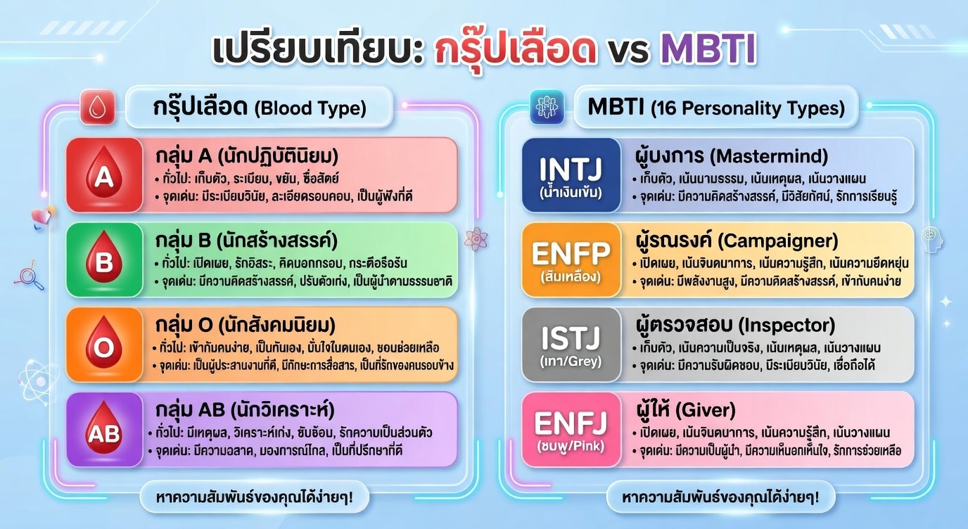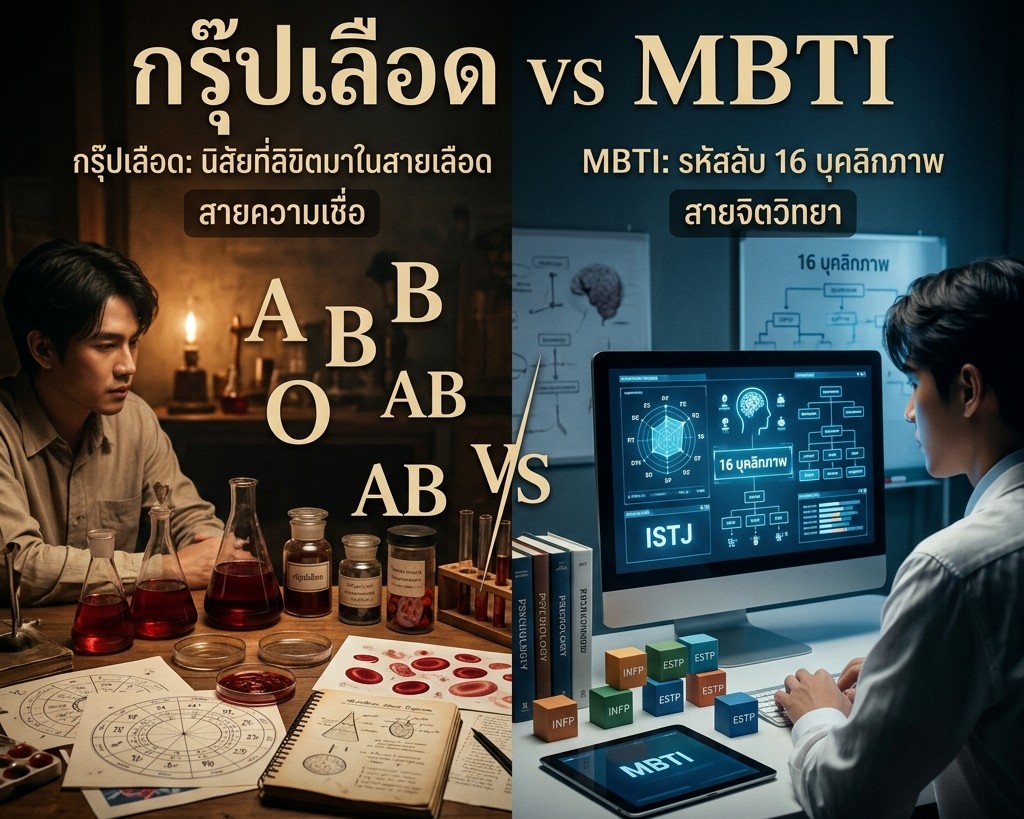 เมื่อพูดถึงการวิเคราะห์นิสัย สองสิ่งที่มักถูกหยิบมาถกเถียงกันมากที่สุดคือ "กรุ๊ปเลือด" (สายความเชื่อ) และ "MBTI" (สายจิตวิทยา) แม้เป้าหมายจะเพื่อทำความเข้าใจมนุษย์เหมือนกัน แต่ที่มาและวิธีคิดนั้นต่างกันอย่างสิ้นเชิง