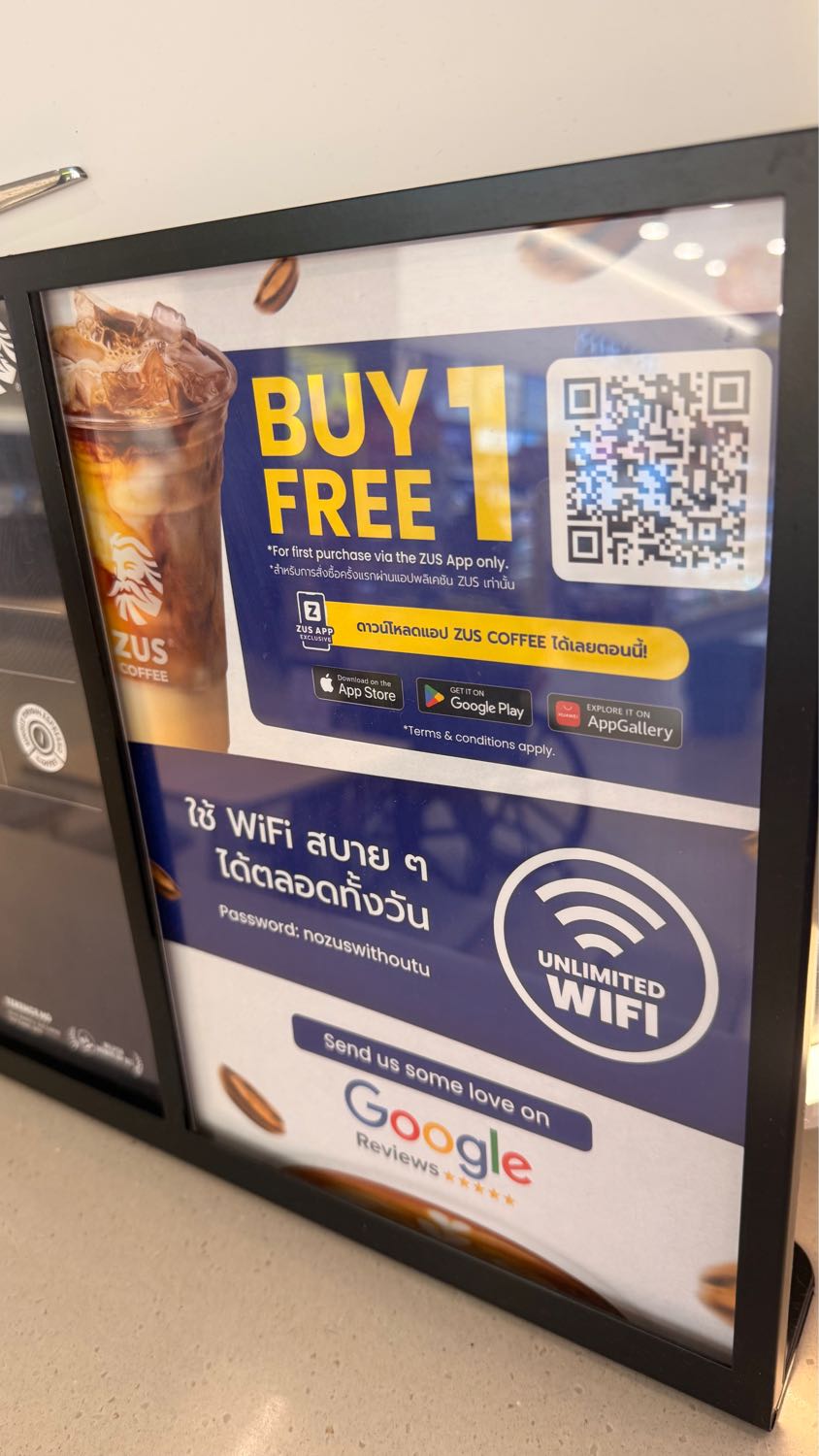 จนไปเจอร้านกาแฟ Zus (มาจากมาเลเซีย) เราเห็นโฆษณานานบ่ะ ว่า 1 แถม 1 และลงแอพใส่มือถือ ไว้แล้ว แต่ยังไม่ Registered นะ