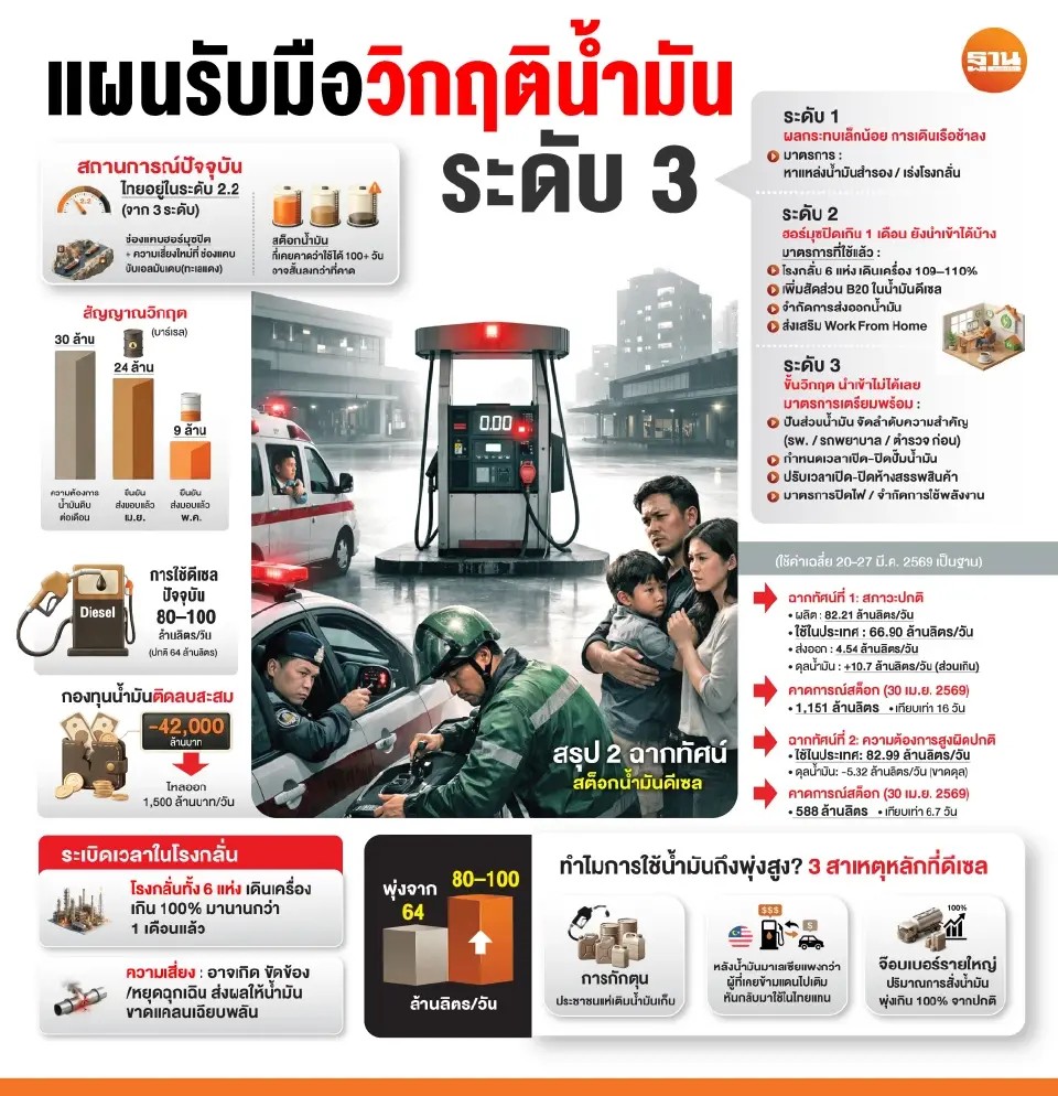 ศบก. ยังได้วิเคราะห์เส้นทางสต็อกน้ำมันดีเซลออกเป็น 2 ฉากทัศน์ โดยใช้ค่าเฉลี่ยระหว่างวันที่ 20–27 มีนาคม 2569 เป็นฐาน ดังนี้