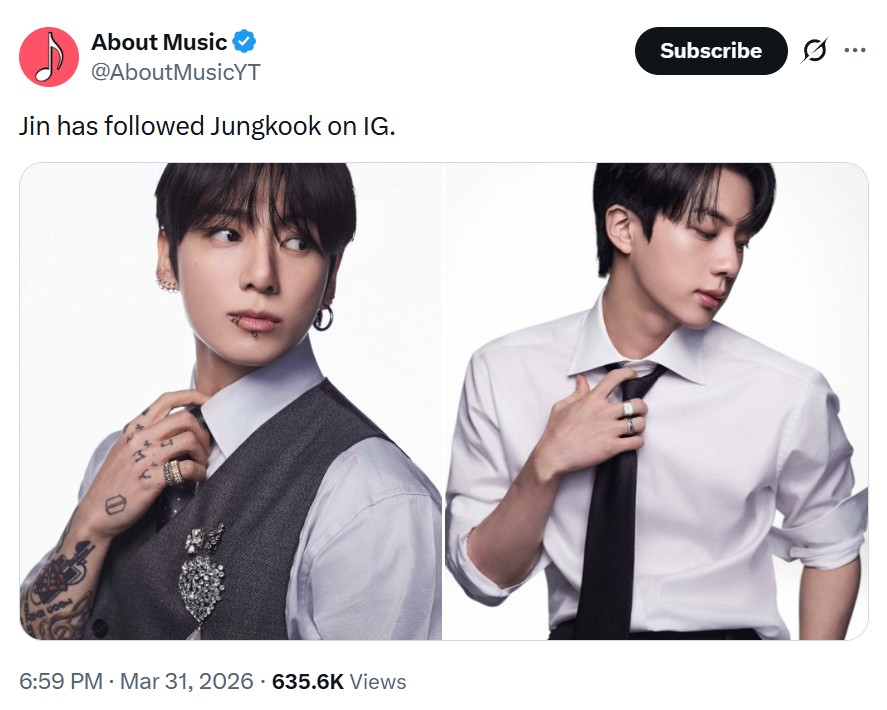 ถึงกับมีสร้างแอคเคาท์ขึ้นมาเพื่อติดตามว่า พี่จินกดติดตาม ig ของจองกุกแล้วหรือยัง และตอนนี้แอคเคาท์นี้ก็ประกาศว่าภารกิจเสร็จสิ้นแล้ว