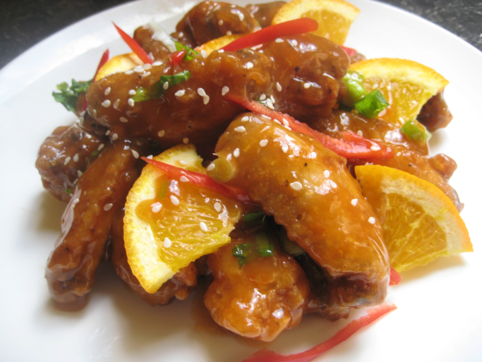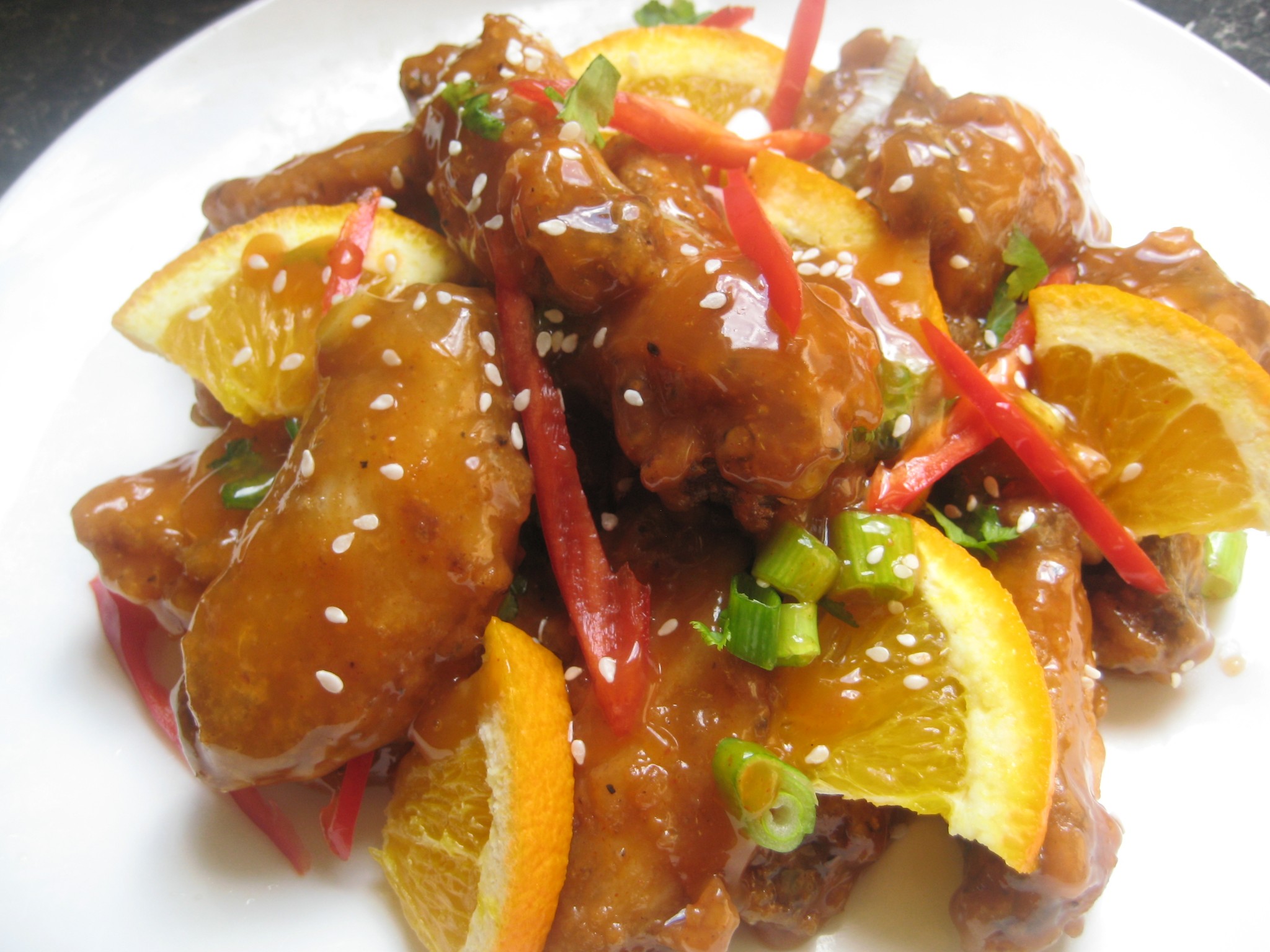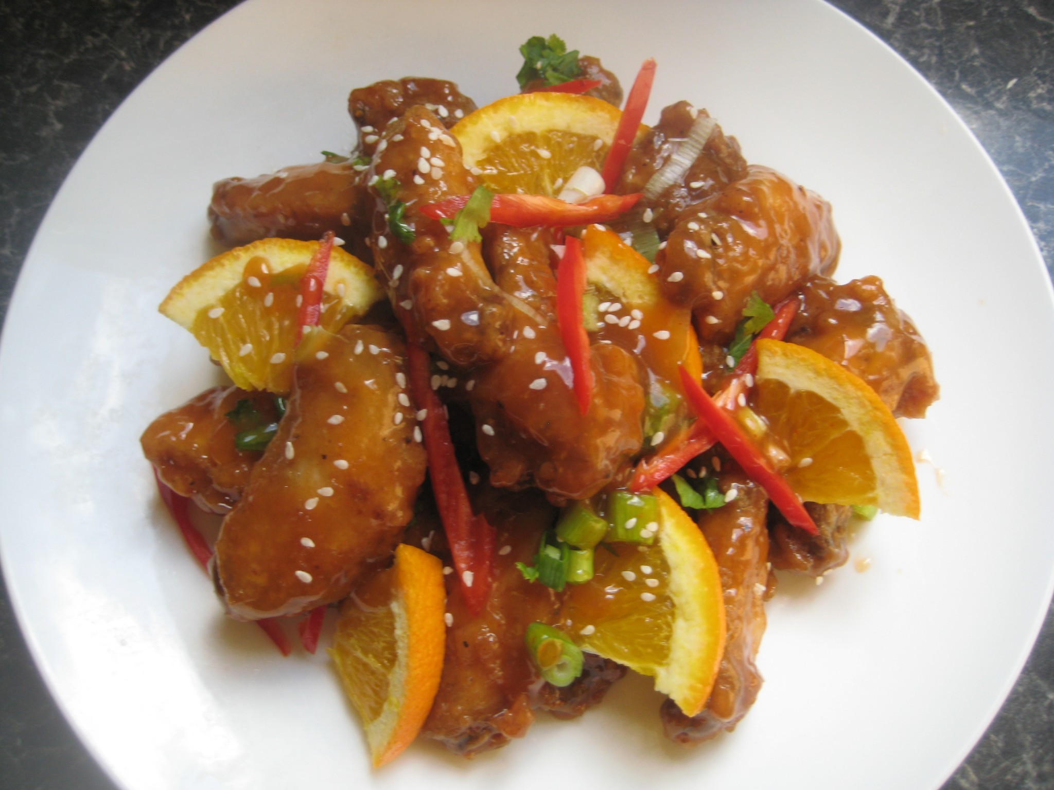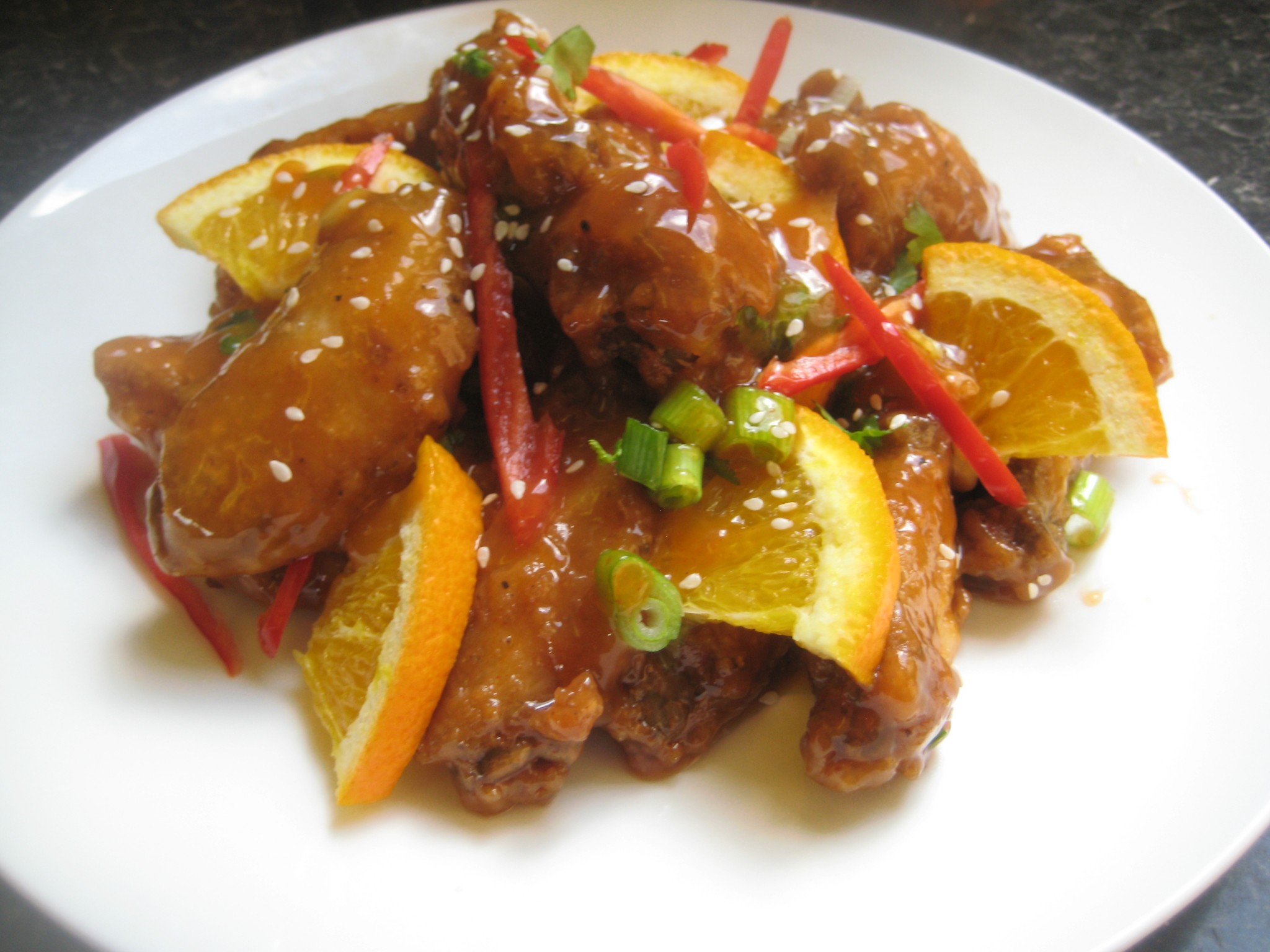 นำปีกไก่ทอดไว้มาคลุกเคล้ากับซอสส้มให้ทั่วชิ้นไก่ โรยด้วยต้นหอมผักชี คนให้เข้ากัน