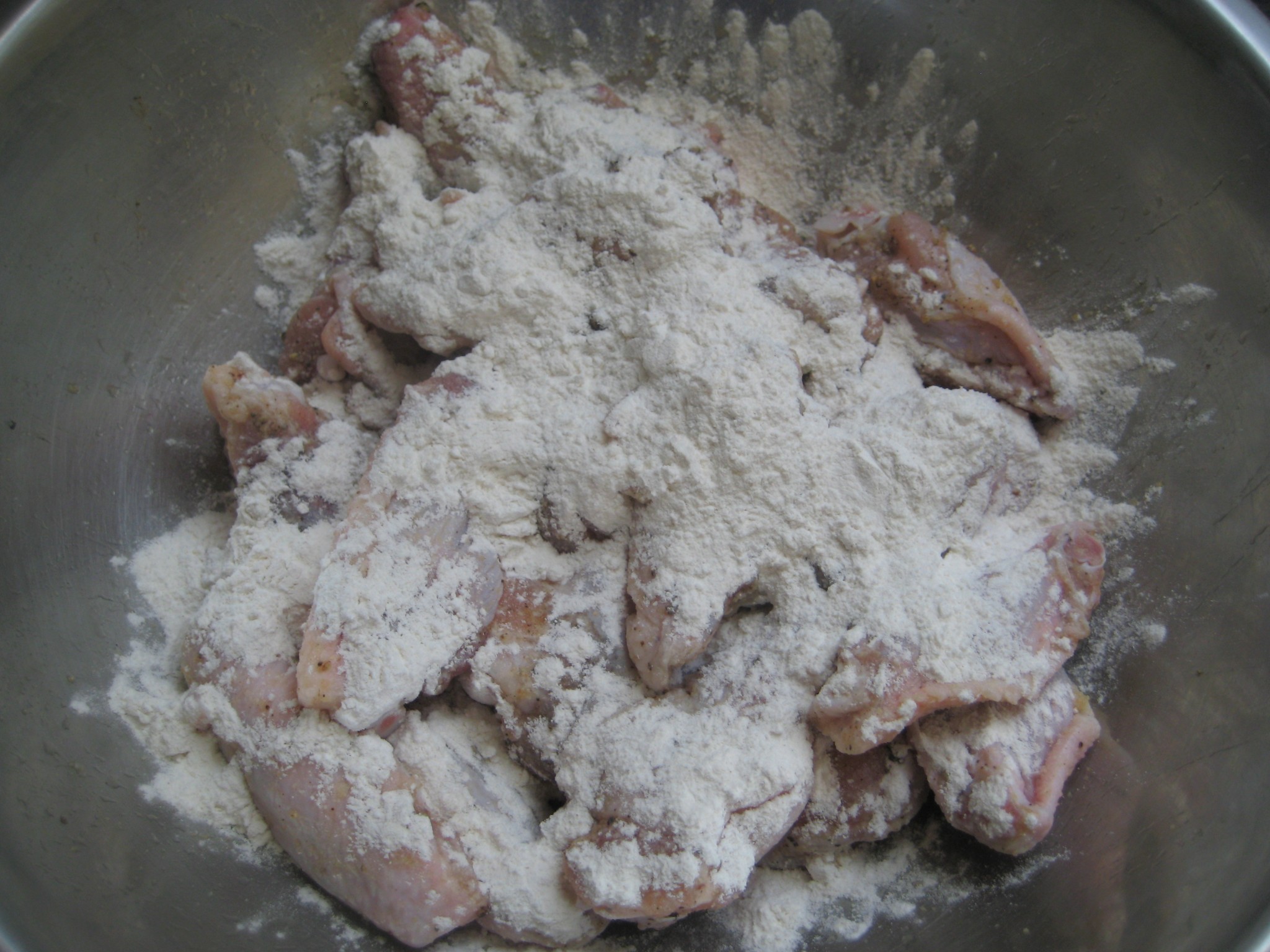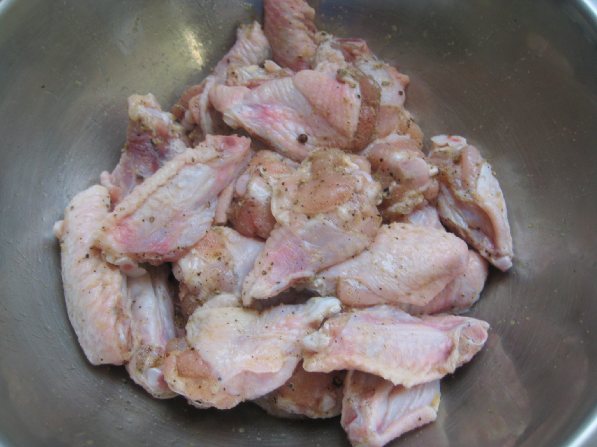 นำปีกไก่ไปหมักด้วยเกลือป่น กระเทียมผงและพริกไทยป่น คลุกให้เข้ากันหมักทิ้งไว้ประมาณ 15-20 นาที