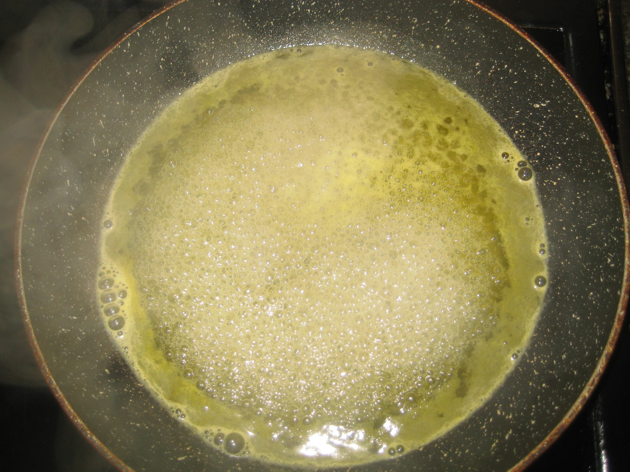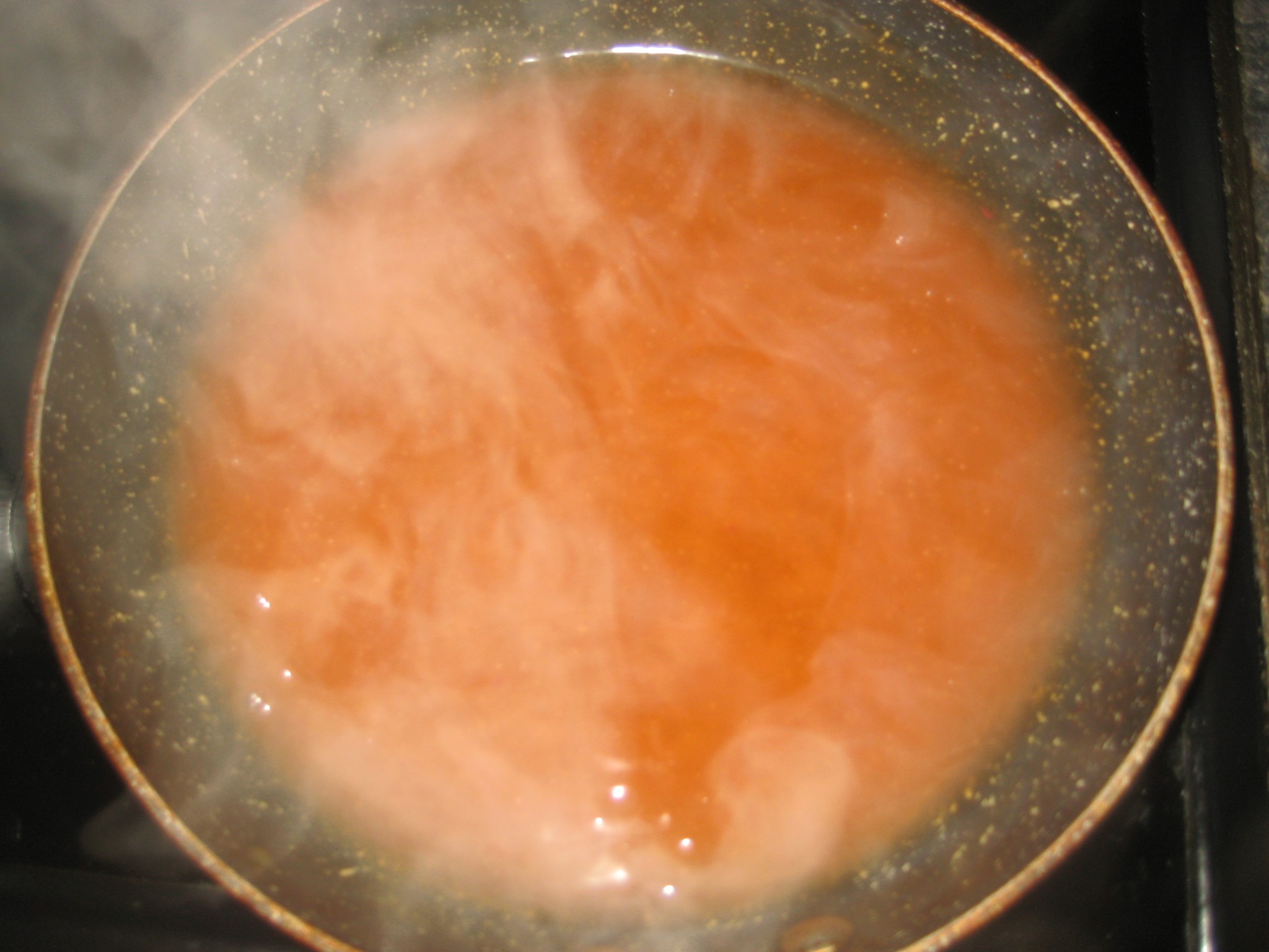 ตั้งกระทะบนเตาใช้ไฟอ่อน ใส่น้ำตาลและน้ำเปล่าเล็กน้อยลงกระทะ รอให้น้ำตาลละลายจนหมดทิ้งไว้ให้น้ำตาลเริ่มมีสีน้ำตาลอ่อน ๆ