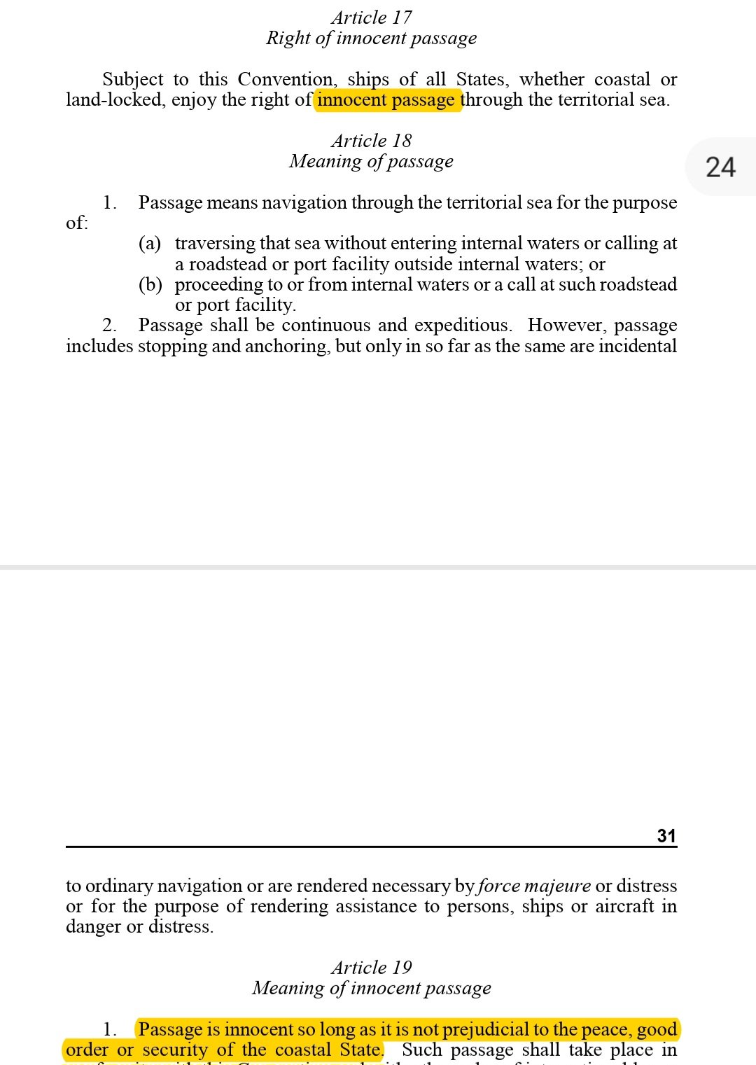 ตามมาตรา 19 ของอนุสัญญาระบุว่า "การผ่านแดนถือว่าบริสุทธิ์ตราบใดที่ไม่ได้กระทบต่อสันติภาพ ความสงบเรียบร้อย หรือความมั่นคงของรัฐชายฝั่ง"