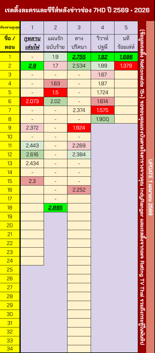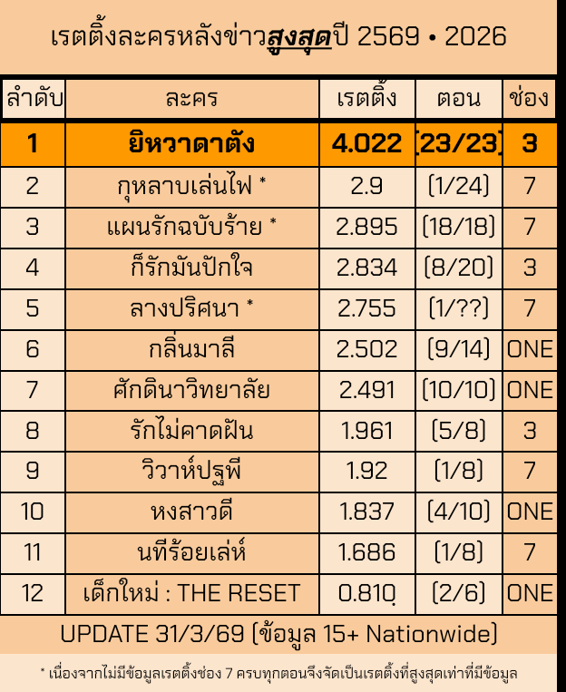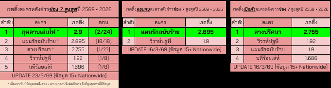 ↓↓ เรตติ้งละครหลังข่าวช่อง 7 ปี 2569 ไตรมาสแรก ↓↓