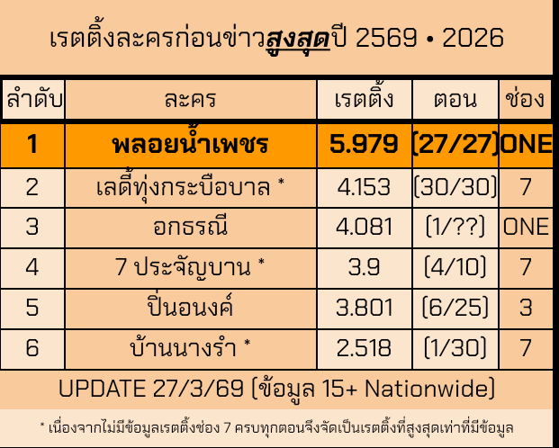 ↓↓ เรตติ้งละครก่อนข่าวช่อง 7 ปี 2569 ไตรมาสแรก ↓↓
