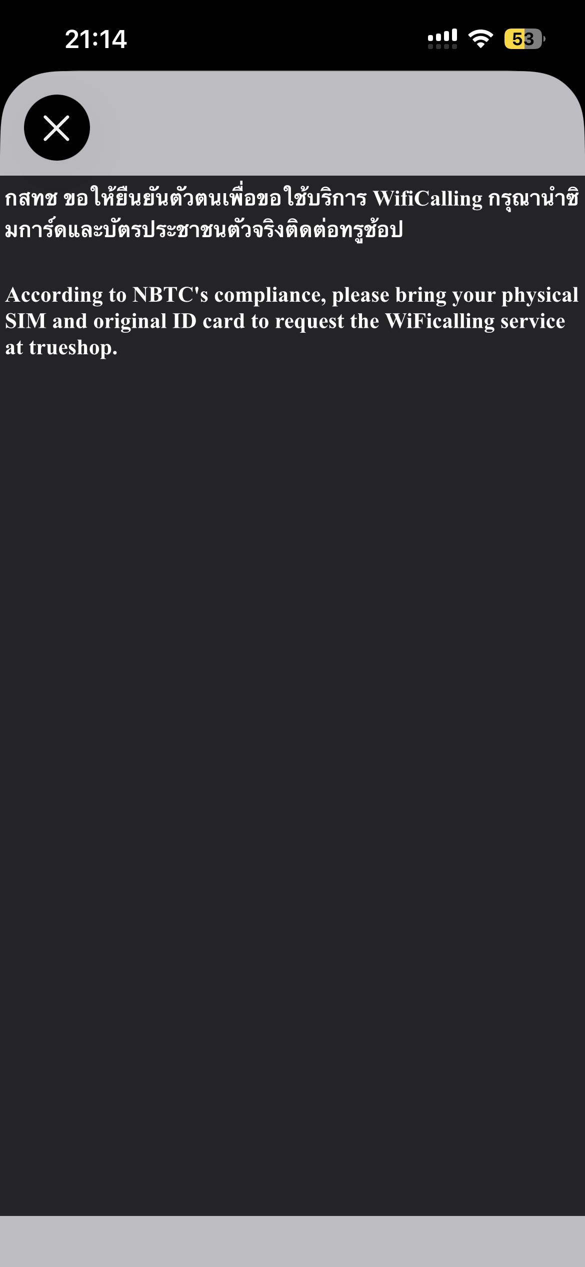 ไปติดต่อที่ช้อปทรูแล้วว่าจะมีต้องมาอยู่ต่างประเทศเป็นระยะเวลาหนึ่ง แต่เหมือนขั้นตอน wifi-calling ไม่สำเร็จ เพราะพอจะเปิดใช้งาน ก็ได้รับข้อความตามภาพ ตอนนี้มาอยู่ต่างประเทศแล้ว ไม่สามารถไปยืนยันตัวที่ช้อปได้ ทำยังไงดีคะะ 😭
