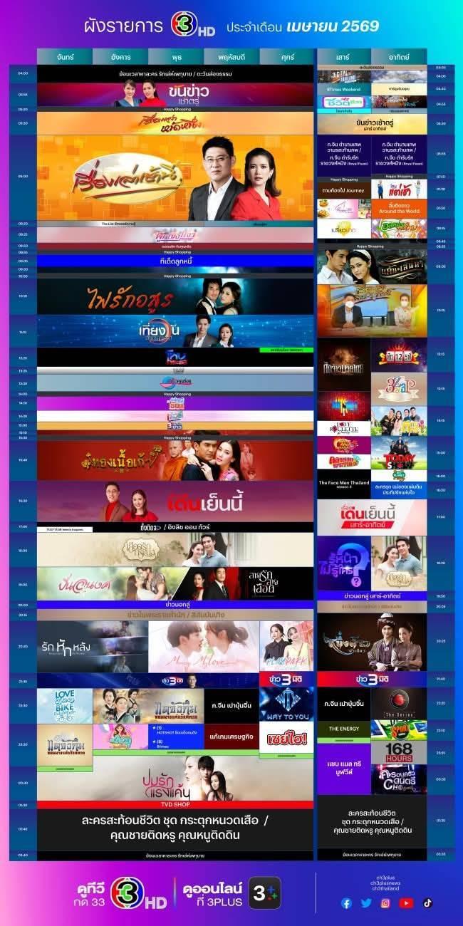📌🔴 ผังรายการช่อง 3HD เดือนเมษายน 2569 📌🔴 รักหักหลัง/ โทษฐานที่รักเธอ/ รักเติมเต็ม/ รักได้หรือ Young/ สายรักสายเลือด