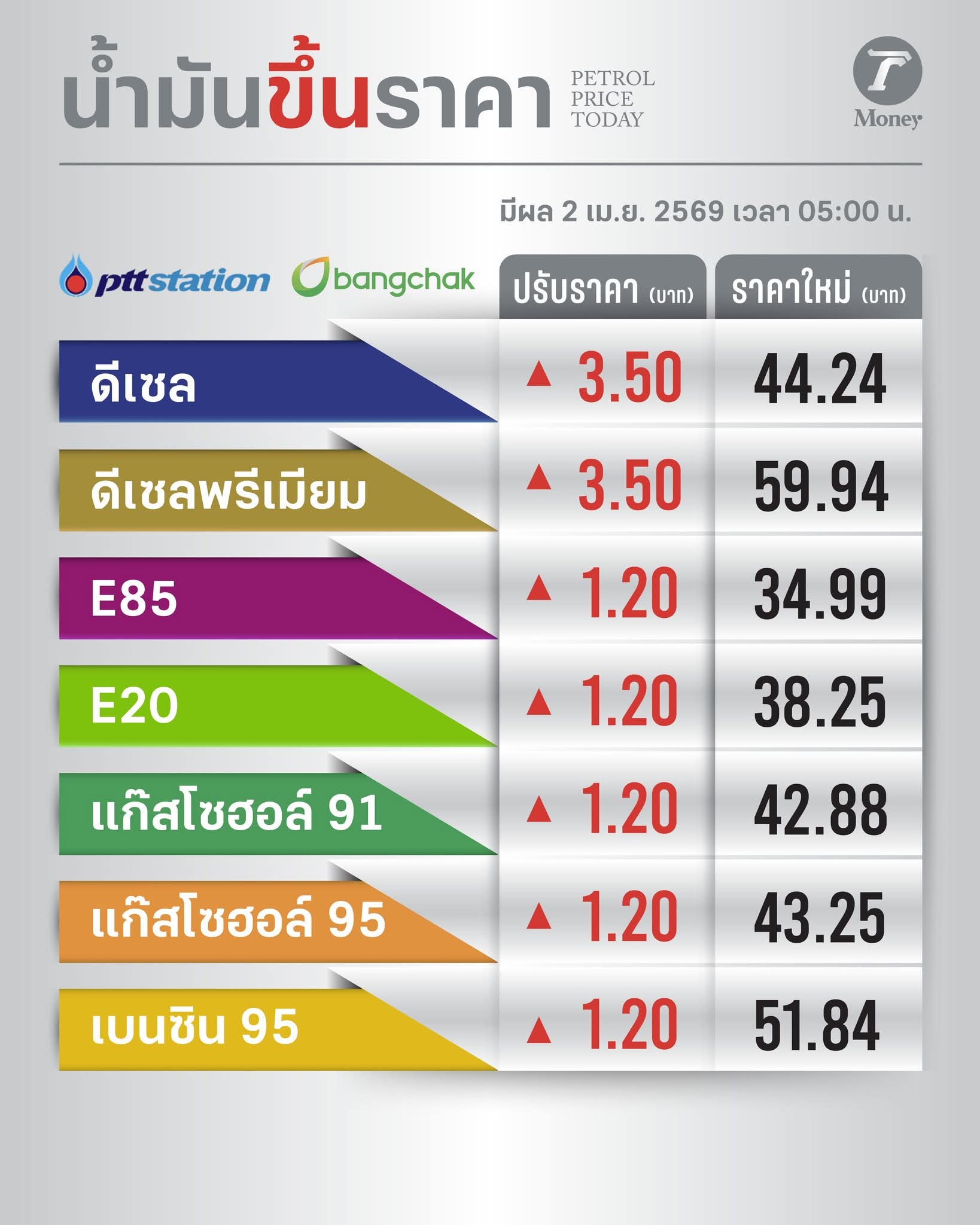 ผู้สื่อข่าวรายงานว่า พีทีที สเตชั่น และ บมจ.บางจากปิโตรเลียม หรือ BCP ประกาศปรับขึ้นราคาน้ำมันกลุ่มดีเซล 3.50 บาทต่อลิตร ขณะที่กลุ่มเบนซิน-แก๊สโซฮอล์ ปรับเพิ่ม 1.20 บาทต่อลิตร เริ่มมีผลตั้งแต่เวลา 05.00 น.วันที่ 2 เมษายน 2569