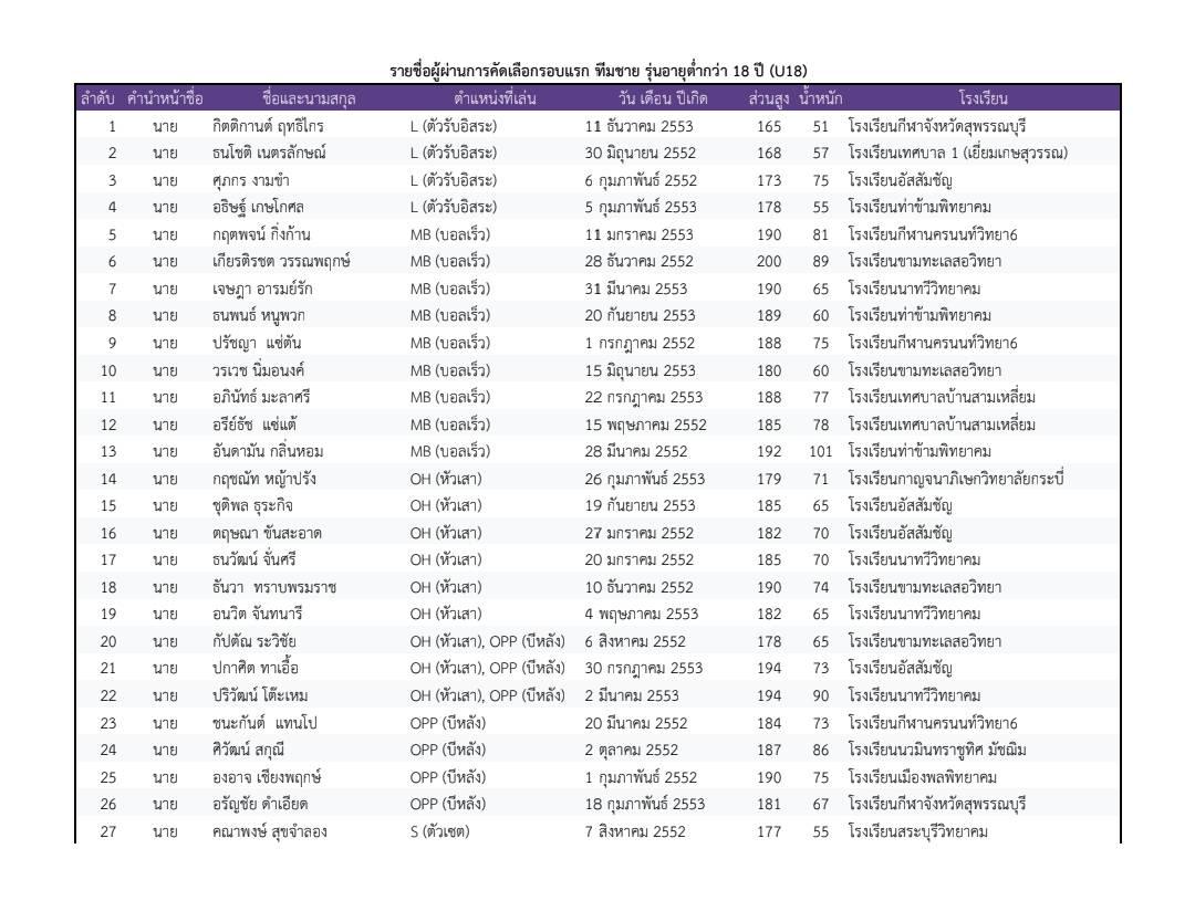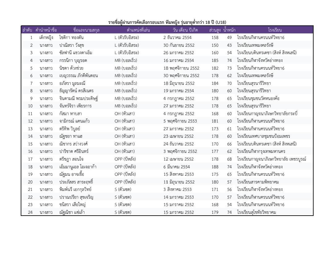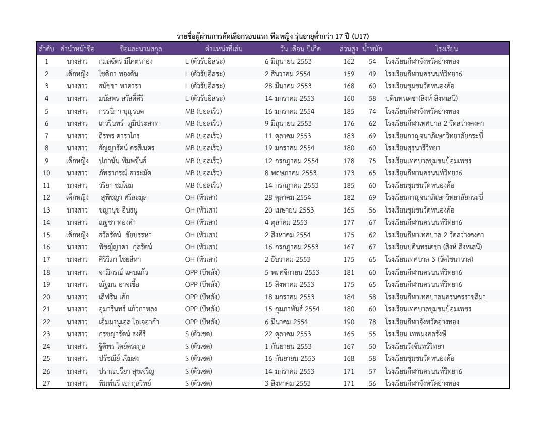 สมาคมกีฬาวอลเลย์บอลแห่งประเทศไทย ประกาศรายชื่อผู้ผ่านการคัดเลือกในรอบแรก สำหรับการคัดเลือกนักกีฬาวอลเลย์บอลเยาวชนทีมชาติไทย ประจำปี 2569 ทั้งประเภทชายและหญิง ในรุ่นอายุต่ำกว่า 18 ปี และรุ่นอายุต่ำกว่า 17 ปี