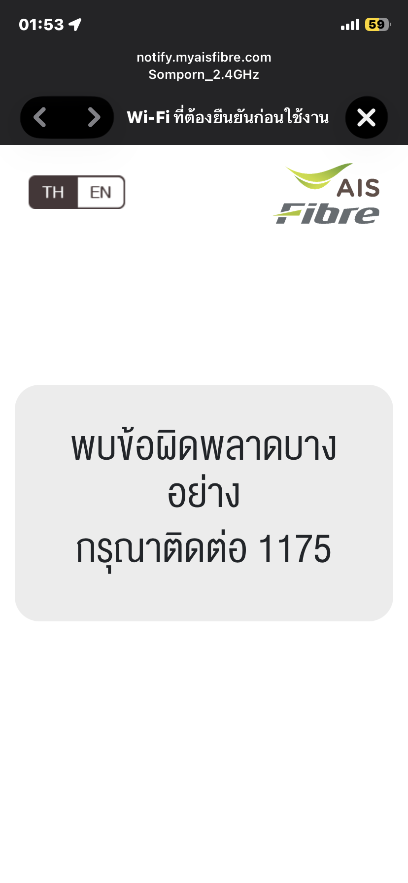 เจ้าหน้าที่บอกจะเปิดสัญญาณให้ ais fiber เบอร์ 8801983332 ครึ่งชั่วโมงแล้วยังใช้ไม่ได้ ขึ้นแบบนี้