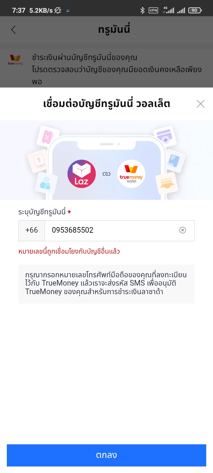พอดีจะเพิ่มวิธีชำระในแอป lazada ด้วย true money บอกว่าติดเชื่อมอีกบัญชี ก็ไปยกเลิกเชื่อมในแอป true money ก็มาเชื่อมใน lazada ไม่ได้