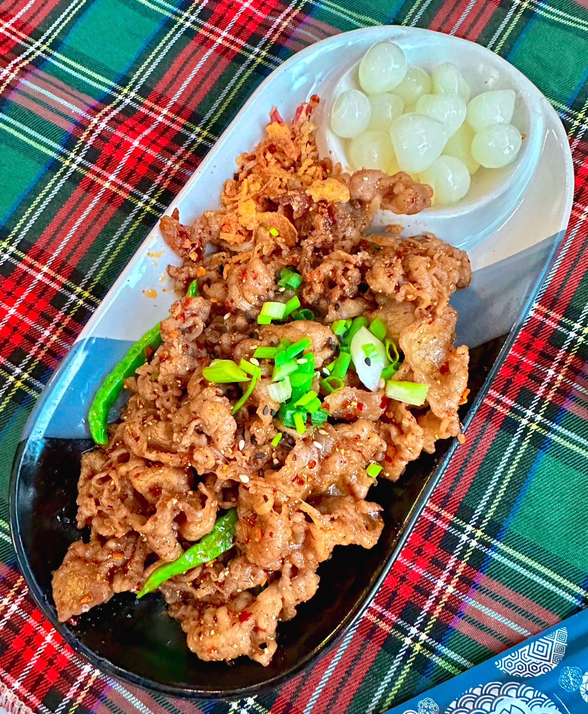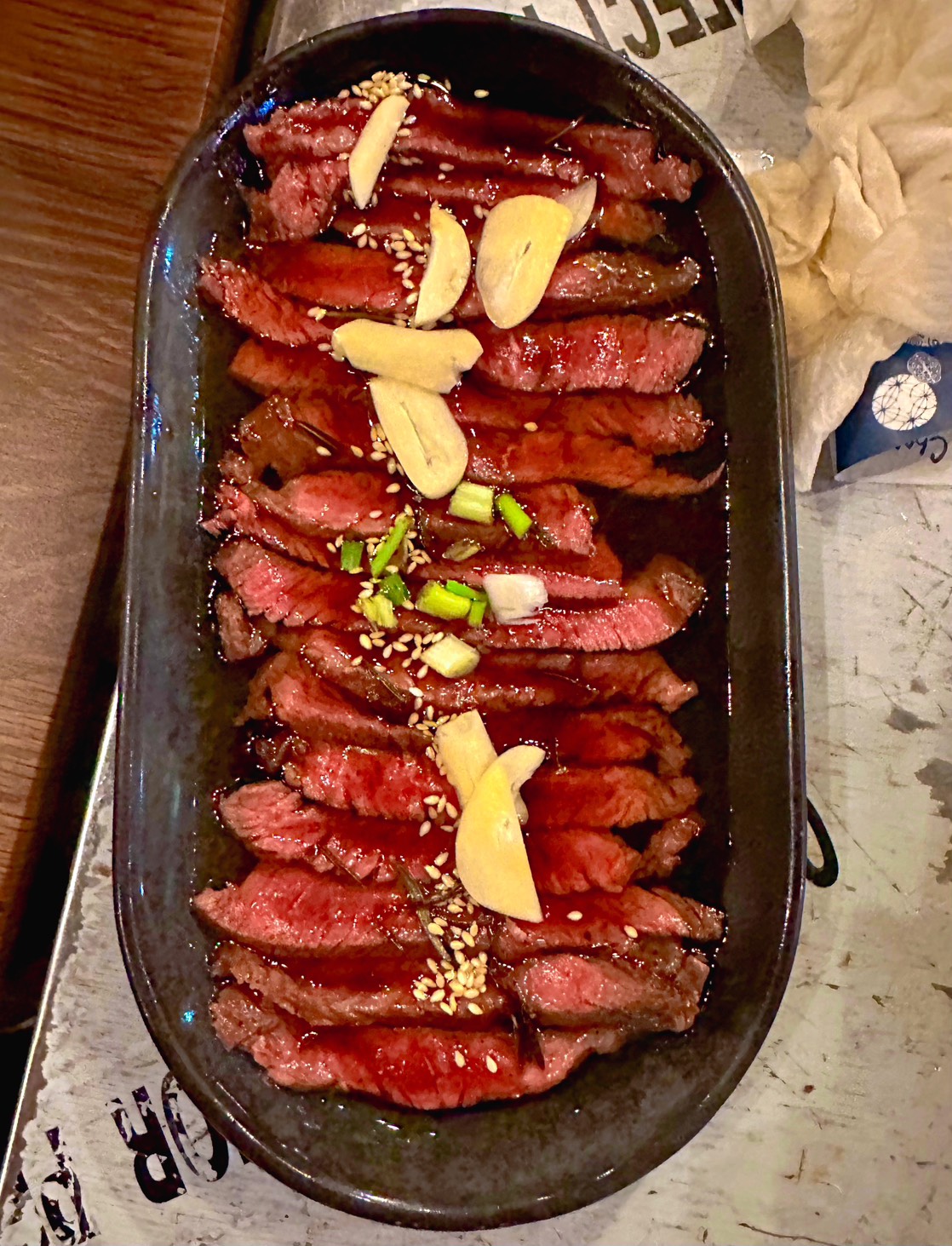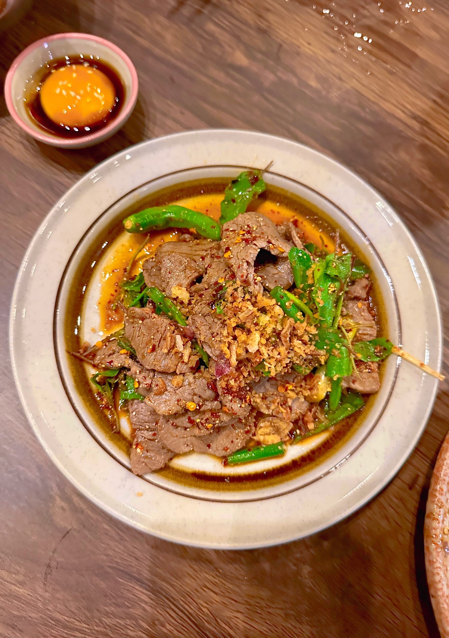 * เนื้อสไลด์จิ้มแจ่วกระเทียมโทน: ย่างมาดี เสิร์ฟคลุกแจ่วและแนมกระเทียมโทน รสตัดกันได้ดีเยี่ยม (179฿)