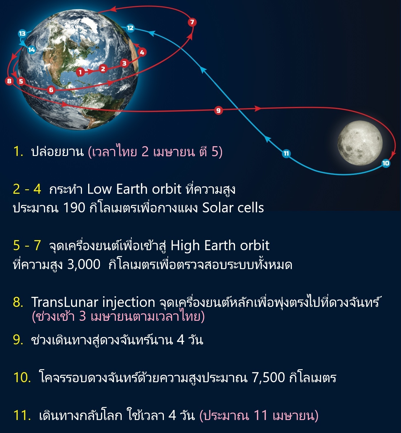 ขณะนี้อยู่ในขั้น 2 ถึง 5 .... และพรุ่งนี้จะเข้าขั้นตอน 5 - 8 พุ่งตรงไปยังดวงจันทร์