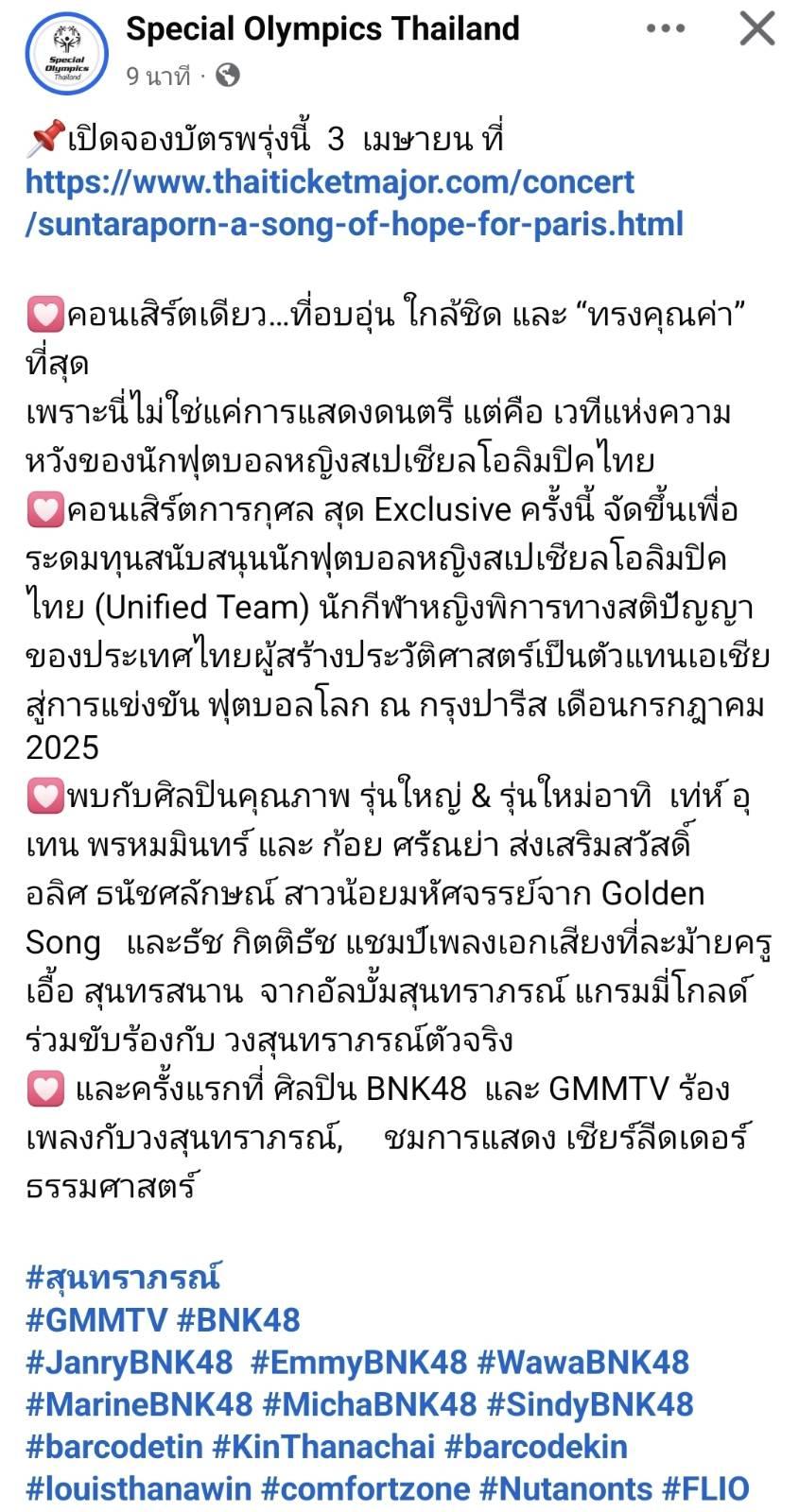 ศิลปินจาก BNK48 และ GMMTV เตรียมร้องเพลงร่วมกับวงสุนทราภรณ์ในคอนเสิร์ตการกุศลของสมาคมกีฬาสเปเชียลโอลิมปิคฯ