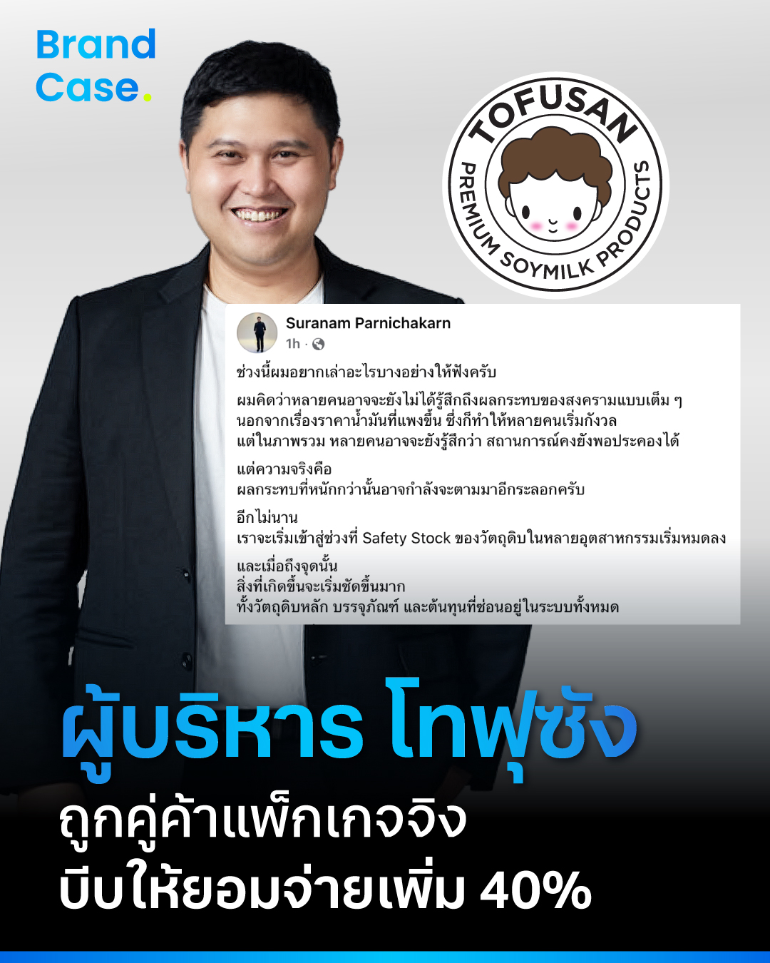 -คุณนาม-สุรนาม พานิชการ เจ้าของแบรนด์ โทฟุซัง โพสต์ในเฟซบุ๊กส่วนตัว เล่าเรื่อง สถานการณ์ต้นทุนสินค้าที่กำลังเพิ่มขึ้นตอนนี้ จากภาวะสงคราม