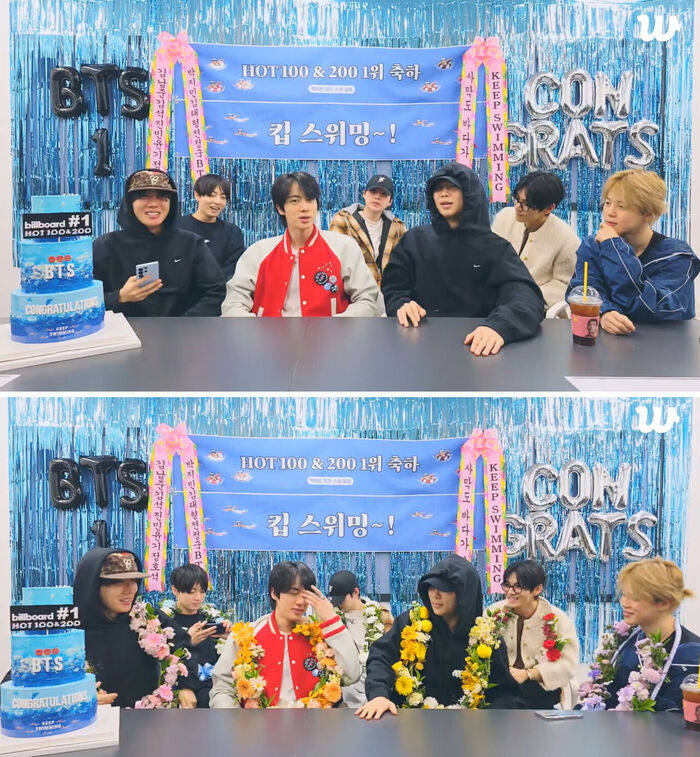 Jin กล่าวว่า “พวกเราฉลองกันเองอยู่แล้ว แต่คิดว่าน่าจะดีถ้าได้ฉลองร่วมกับ ARMY ทุกคนด้วย เลยเปิดไลฟ์ขึ้นมา นี่เป็นอัลบั้มแรกหลังจากไปเข้ากรมมา แล้วมันประสบความสำเร็จแบบนี้ เลยรู้สึกดีมากครับ”