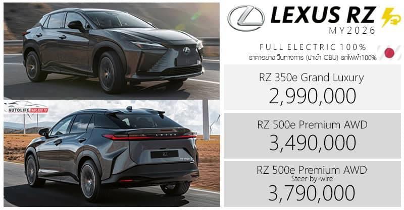 Lexus RZ (MY2026) รถไฟฟ้า100% (RZ 350e / RZ 500e) ราคาอย่างเป็นทางการ : 2,990,000 – 3,790,000 บาท (นำเข้า CBU ญี่ปุ่น)