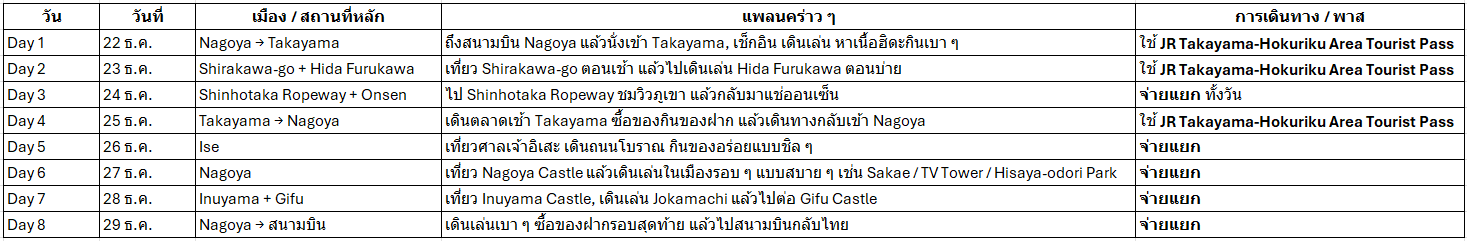 เราแบ่งเมืองพักแบบนี้เพราะอยากอยู่ Takayama ให้เต็มอารมณ์ไปเลย จะได้ไม่ต้องลากกระเป๋าย้ายที่นอนทุกวัน แล้วค่อยกลับมานอน Nagoya เพื่อเป็นฐานออกไปเที่ยวเมืองรอบ ๆ ต่อ สะดวกกว่าเยอะมาก 💙