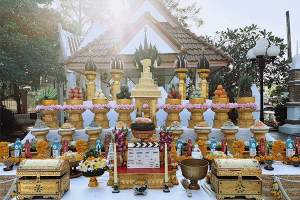 จัดเต็มด้วยดอกไม้ เครื่องบูชา และเซตงานที่เรียบร้อยดูดี เหมาะสำหรับถ่ายภาพและนำเสนอภาพลักษณ์ของงาน