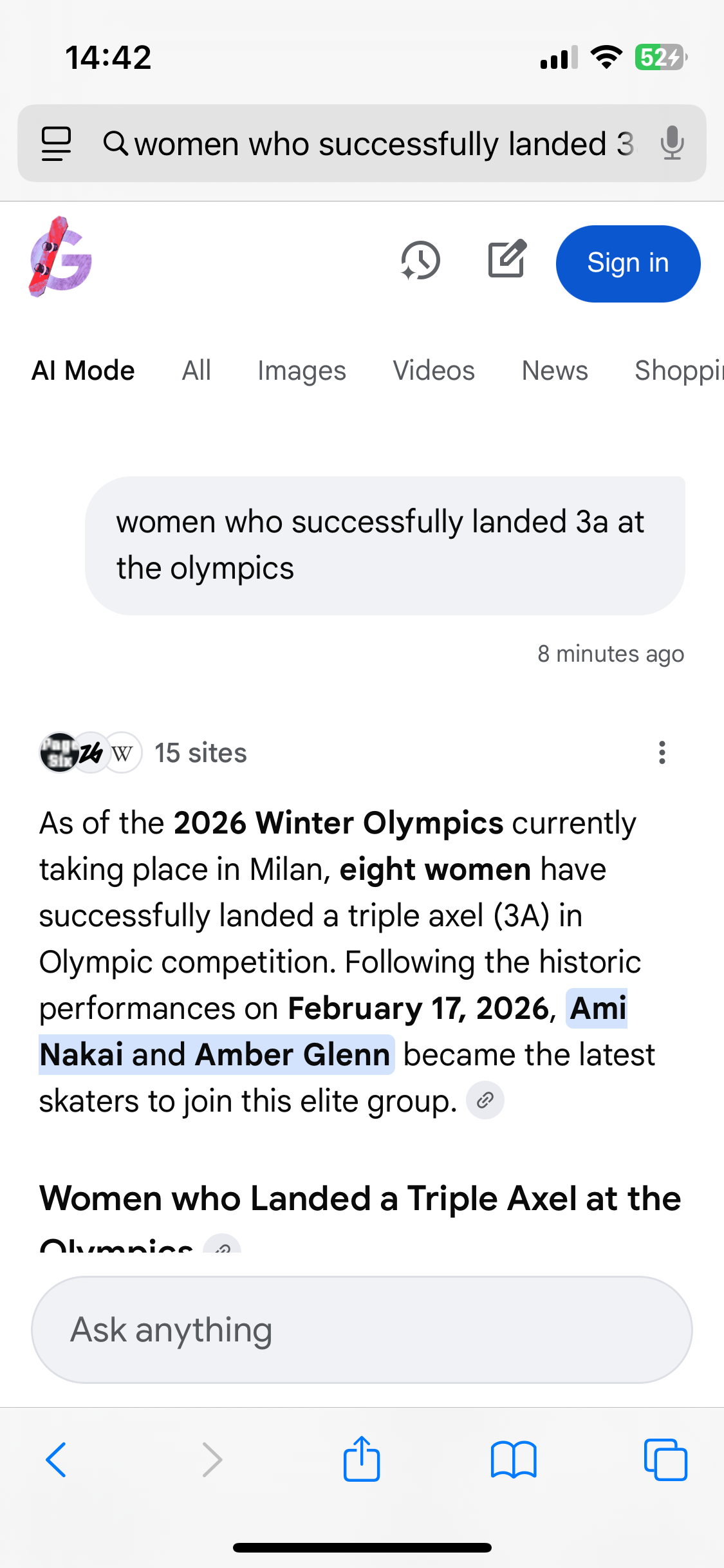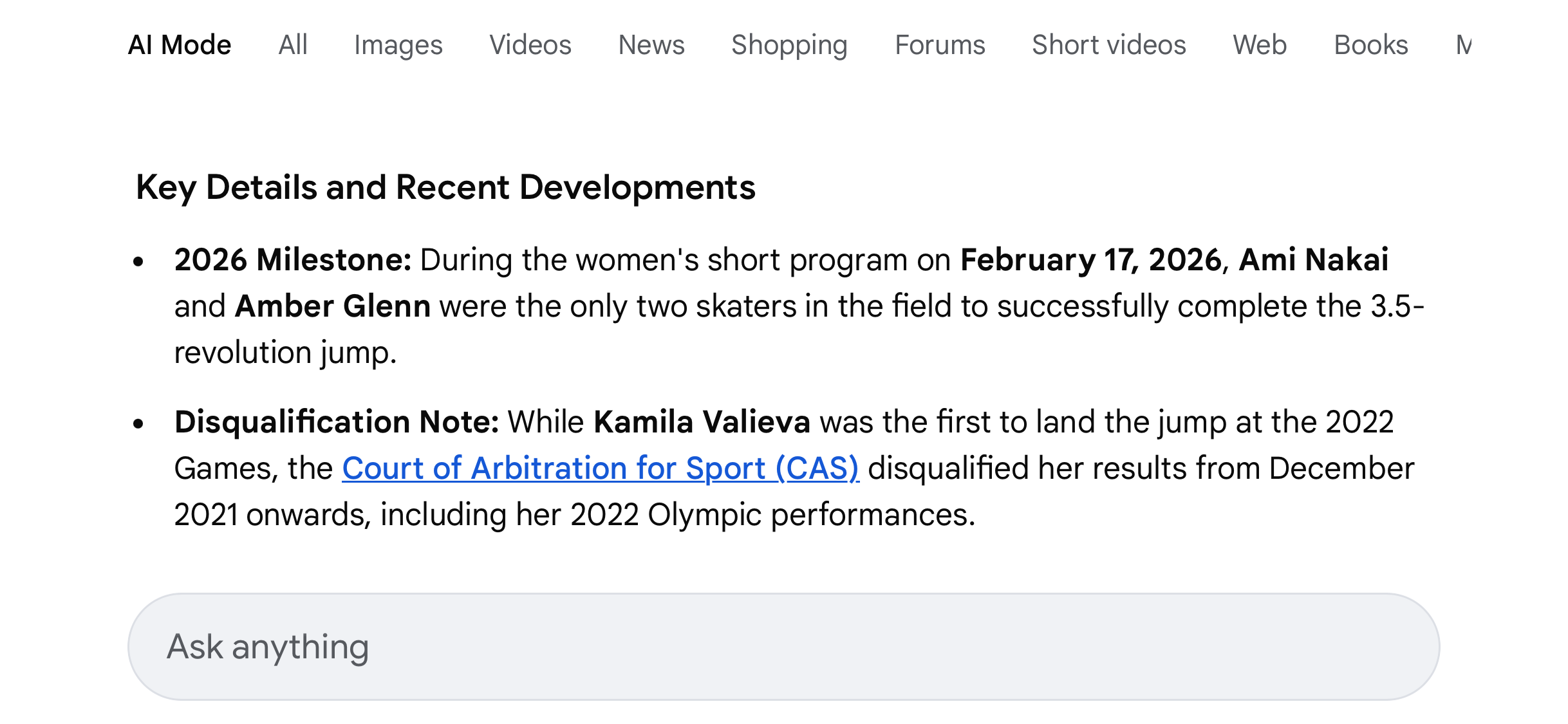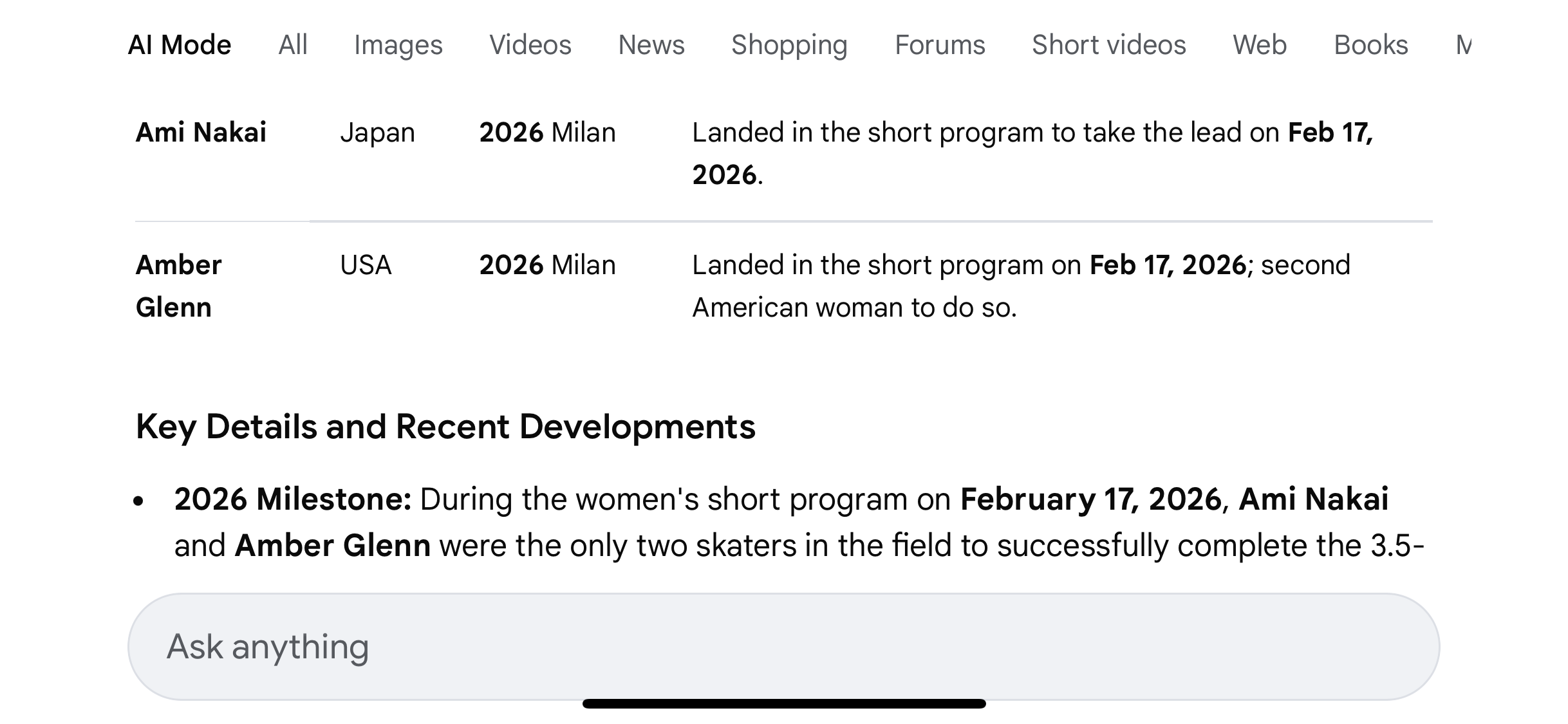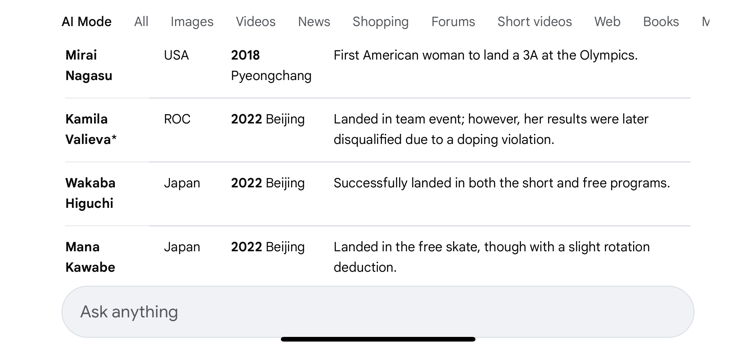 จะเห็นได้ว่ามีนักสเก็ตน้ำแข็งลีลาชาวญี่ปุ่นจำนวนถึง 6 คนที่สามารถทำท่านี้ในโอลิมปิกได้สำเร็จ ส่วนที่เหลือเป็นอเมริกา 2 คน และรัสเซียอีก 1 คนครับ