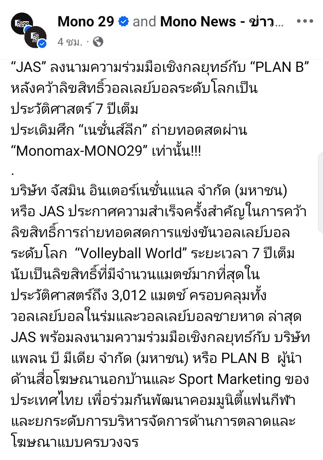 “JAS” 🤝 “PLAN B” 📌 ประเดิมศึก “เนชั่นส์ลีก” ถ่ายทอดสดผ่าน “Monomax-MONO29” เท่านั้น!!!