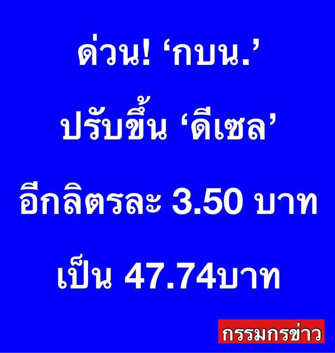 ด่วน! ‘กบน.’ ปรับขึ้น ‘ดีเซล’ อีกลิตรละ 3.50 บาท เป็นลิตรละ 47.74บาท ส่วน ‘เบนซิน’ รอผู้ค้าประกาศ