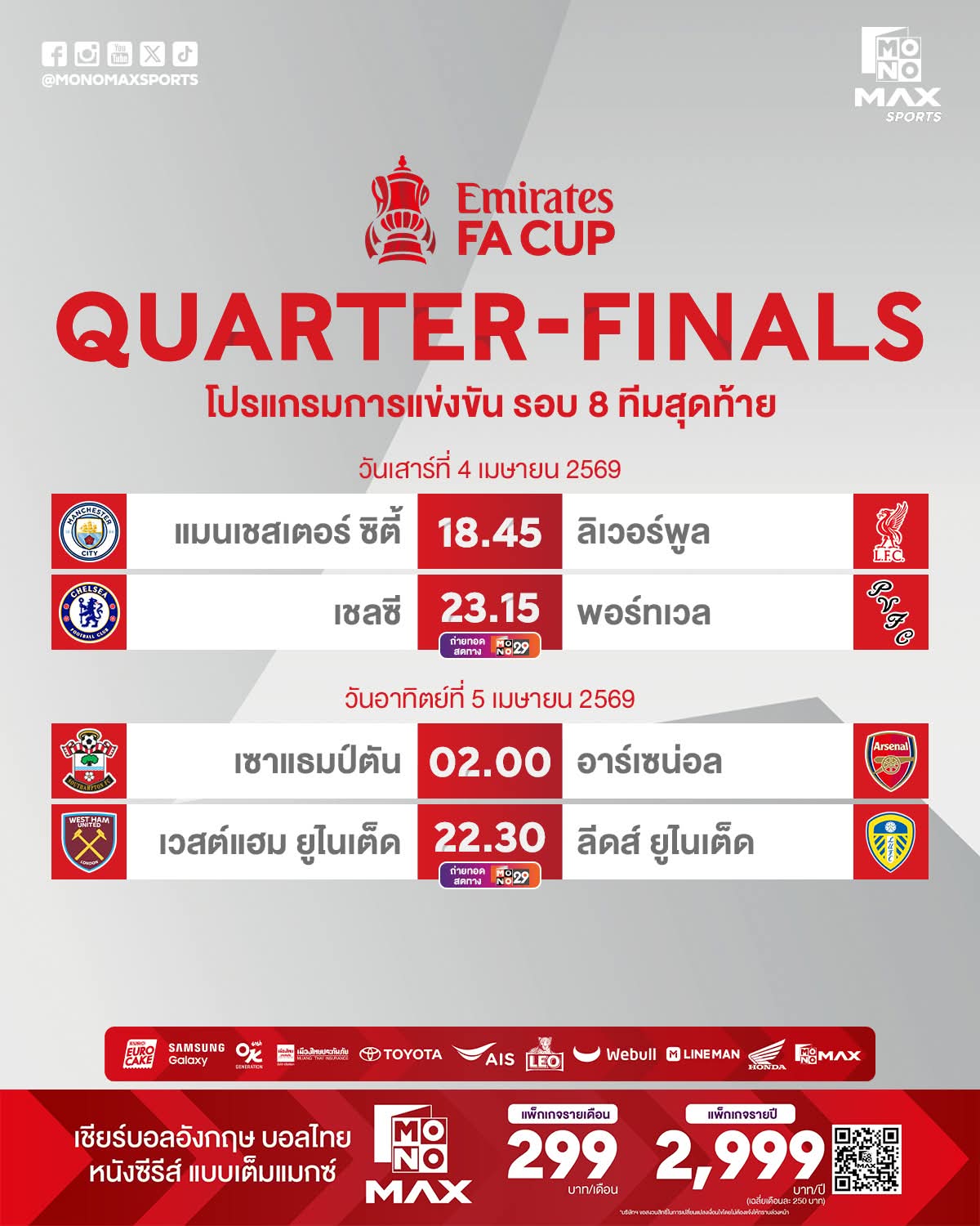 📺 #Mono29 จัดให้ ⚽🏆🏴 #เอฟเอคัพ 2025/26 รอบควอเตอร์ไฟนอล (รอบ 8 ทีม) 🆚