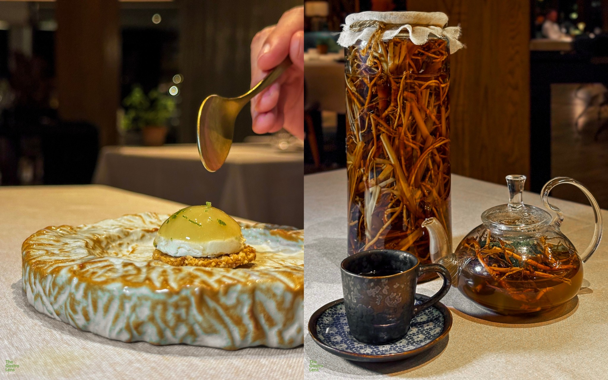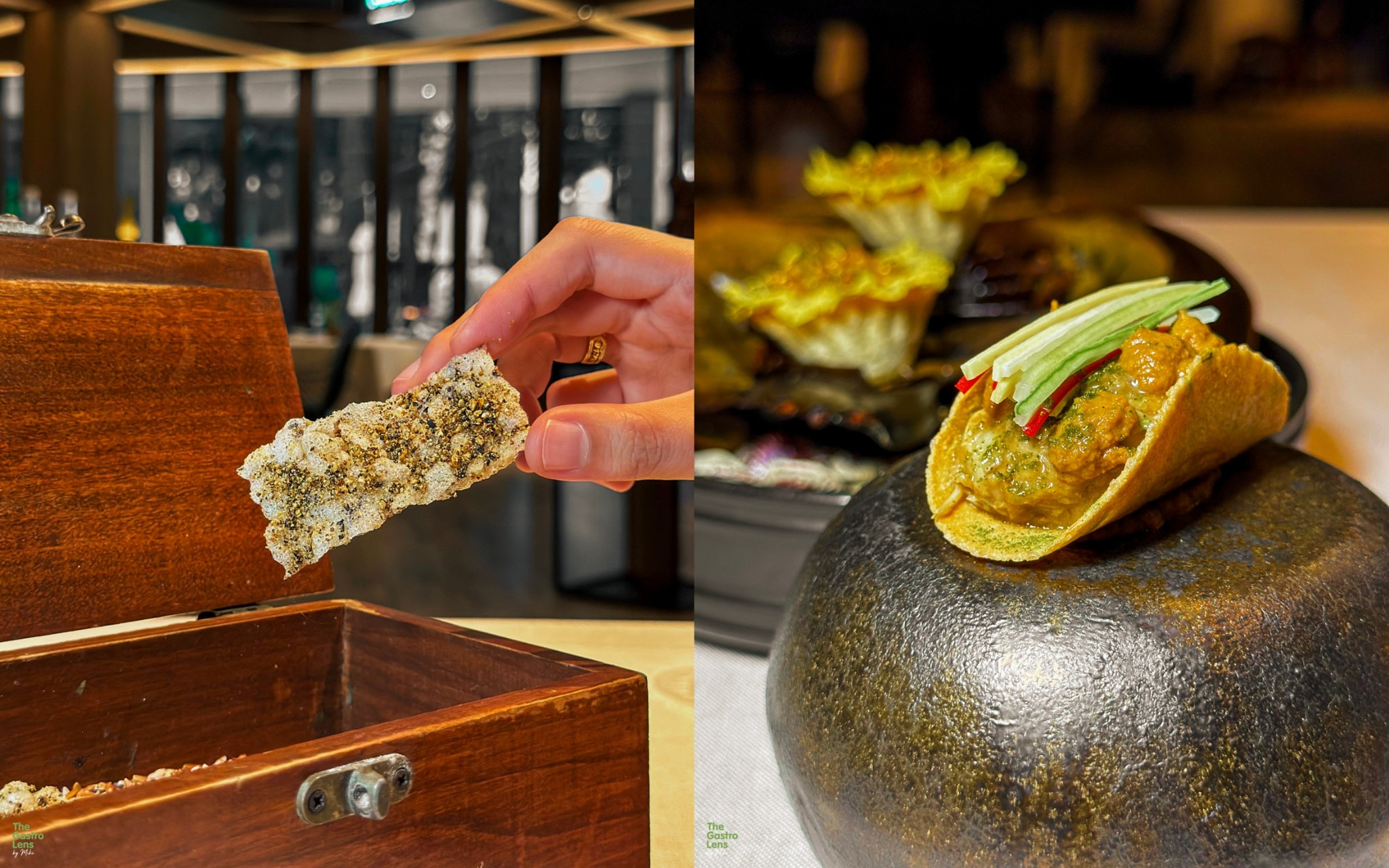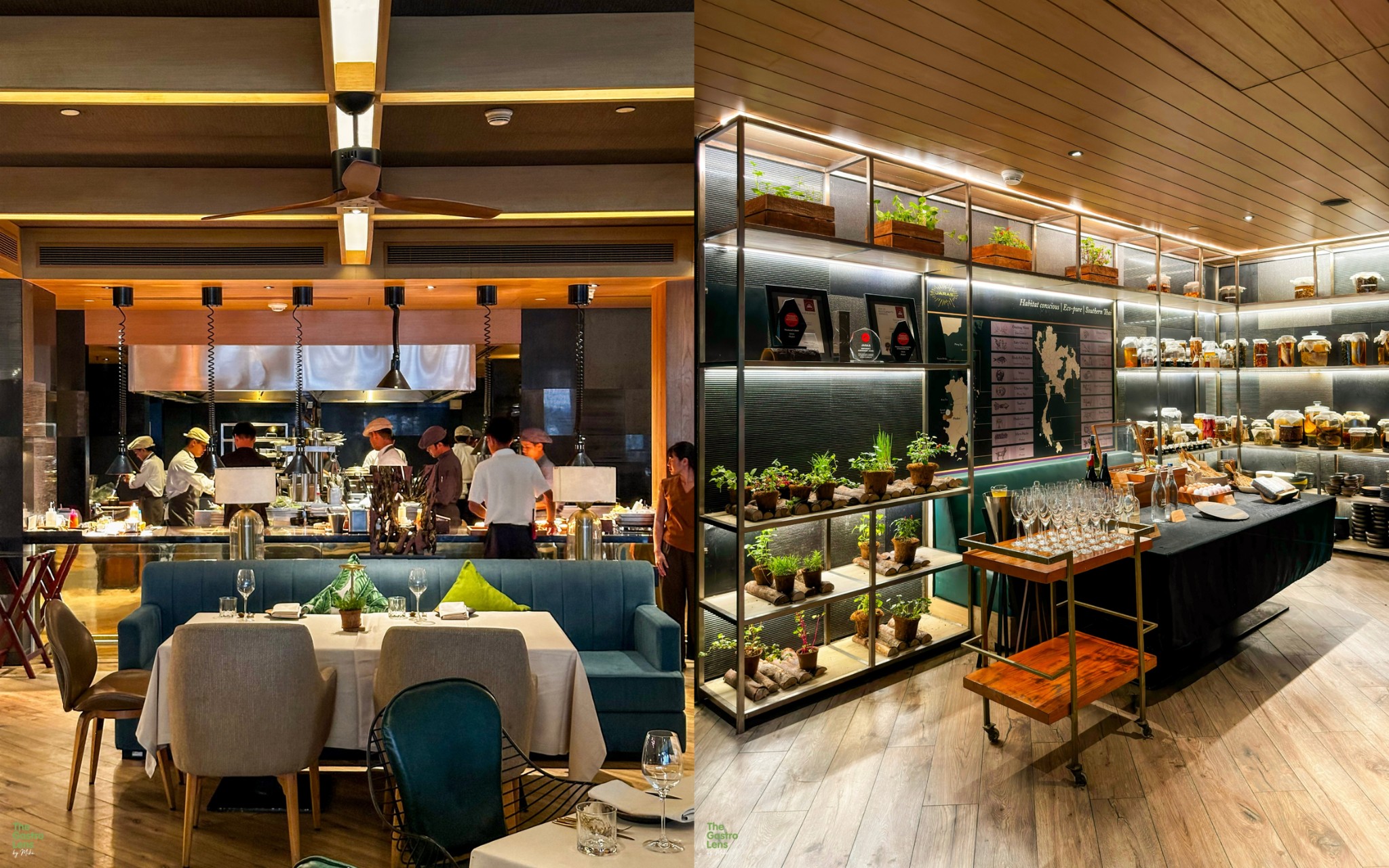 หมูป่ากอและ - คำนี้ใช้เนื้อหมูป่าจากพังงา นำไปซูวีนานถึง 12 ชั่วโมงจนเนื้อนุ่มละมุน ห่อด้วยใบคะน้า ท็อปด้วยผักดอง 4 ชนิดที่ให้รสเปรี้ยวหวานมาช่วยตัดรสชาติได้พอดี